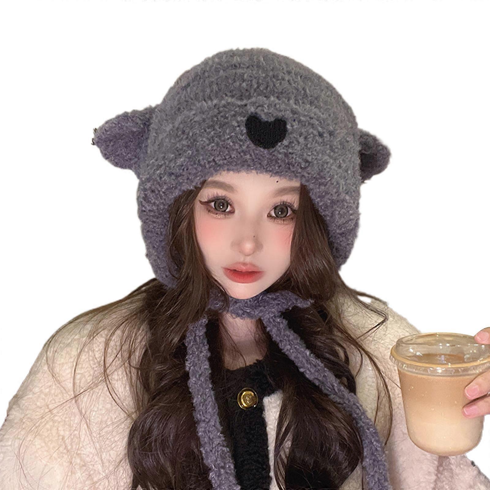 Cartoon Bear Hat Girls Headgear for Outdoors Furry Cuffed Brim with Strap Large Furry Ears Winter Beanie Dark Grey