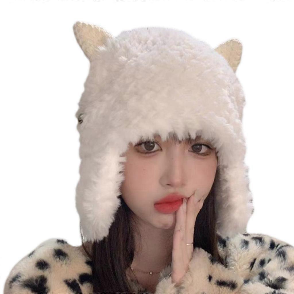 Solid Color Cute Ear Lei Feng Hat Warm Beanie Cap Ear Hat Windproof Winter Gift for Halloween Xmas New Year Thanksgiving White