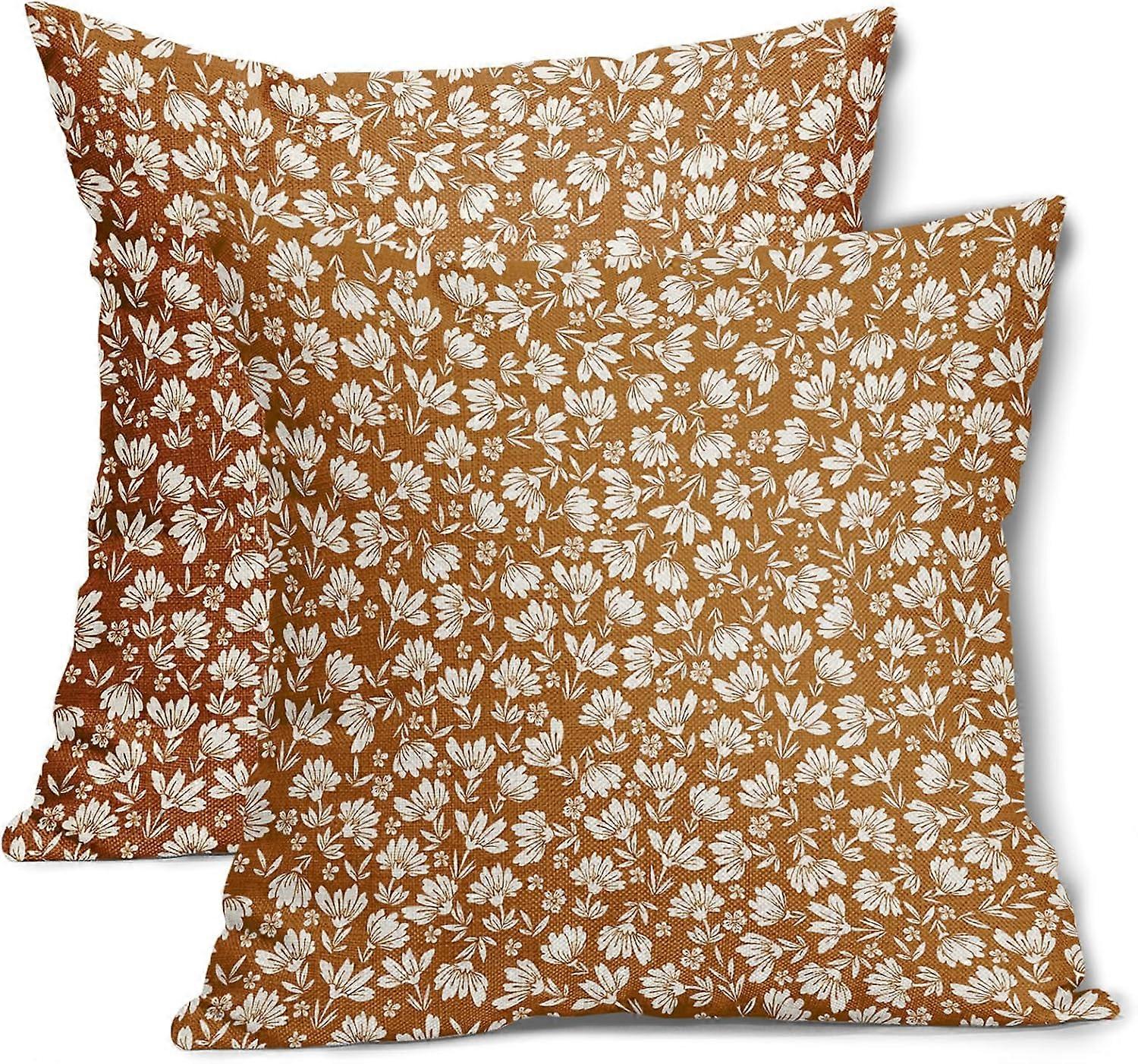 Burnt Orange Beige Daisy Floral Pillow Covers 18X18 Inch Vintage Flowers Decorative Pillow Cases Set of 2 Block Print Cotton Linen Throw Pillows Farmh