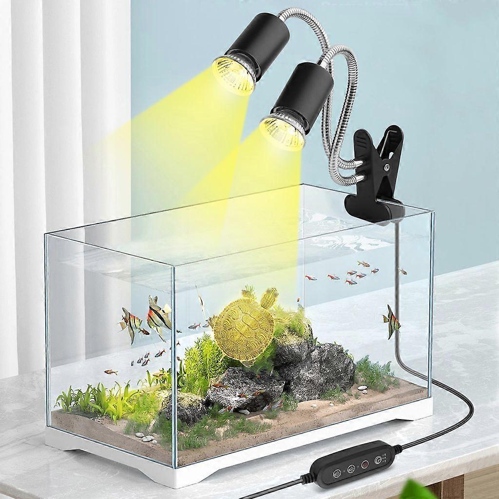 High quality Material : Made of high-quality metal, with a 10.6-inch long and thick double head gooseneck that can rotate flexibly 360 degrees, it is sturdy, rust proof, anti deformation, and has a long service life. The ceramic heating lamp holder has been upgraded to the original plastic lamp holder, which is more heat-resistant and safe. The dual head supports two power circuits, with a wider irradiation area. The newly upgraded bracket is sturdy and not easy to loosen.Upgraded fixture design: With upgraded screws, it can be easily installed on your water tank without the need for tools! And it can grip the water tank tighter than traditional reptile lights! This clip can be fixed to the edges of glass containers, turtle shells, fences, or aquariums. Advanced Timing Function Now you can decide the heating time according to the needs of reptiles, with the latest 2.4.8 hour timing function! It can save energy from light bulbs and extend their lifespan. You can easily adjust the temperature and heat by pressing the+and - buttons. Please note that long pressing the+and - buttons can continuously dim the light. Multi functional The reptile heating lamp is suitable for pet crates of various sizes, suitable for most amphibians and mammals, reptiles, and succulent plants. For example, lizards, spiders, frogs, turtles, snakes, geckos, hermit crabs, birds, chickens, fish, and plants.