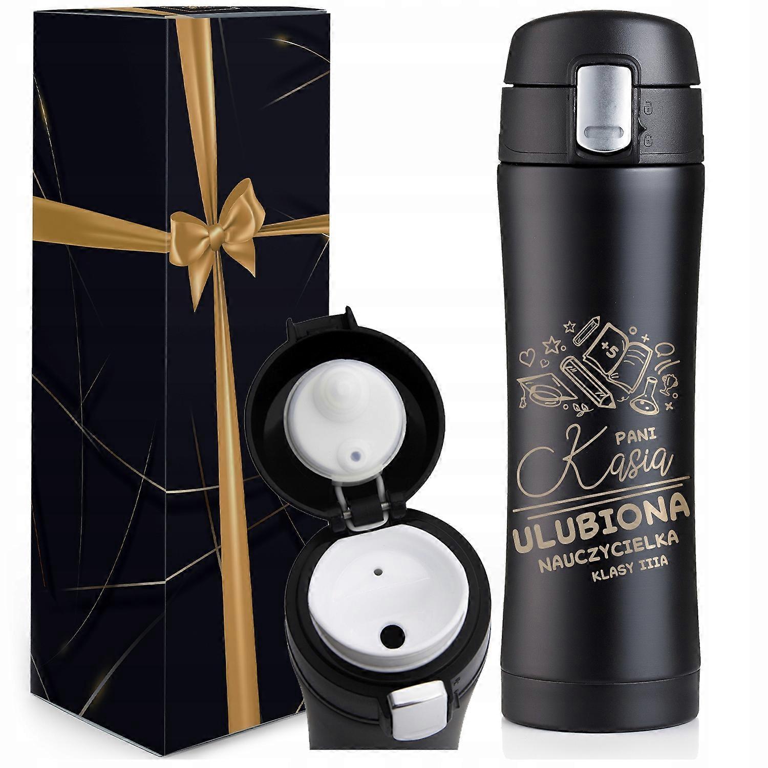 The best features of thermal mug and thermos in one product. The convenient size and mouthpiece, from which you can easily drink, are combined with a completely airtight liquid-proof closure and excellent thermal insulation. Thanks to the vacuum between the walls, the cup keeps the temperature approx. 13 hours. The product uses an innovative lock that protects the cup from accidental opening. The interior is made of steel, the capacity of the cup is 440 ml. Water bottle dimensions: 65 x 230 mm Choose a pattern or provide your information, 1. What a thermos color. 2. What text / what graphics (our pattern or your text) 3. What font (from our tables) e.g.: 1. Champagne colour 2 . S64 , below text: My fastest doping -M.D.- 3. C8 We can make your logo, insert the artwork,... If you are not sure, we will advise, propose, and make a project. Examples of execution: In an additional option, we suggest packing:
