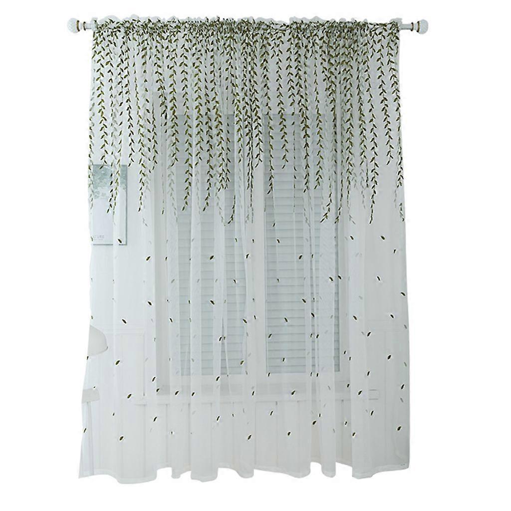 Pastoral Green Willow Leaf Embroidery Sheer Window Curtain Wicker Pattern Tulle Gauze Panel Drapes for Living Room Bedroom Kitchen Home Decoration