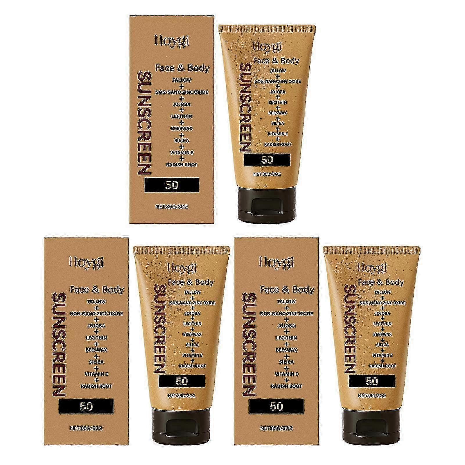 Features:<br> Deeply Nourishing for Dry or Sensitive Skin: The tallow base is enriched with vitamins E, along with fatty acids that moisturize deeply, making it perfect for dry and sensitive skin types. It not only protecting but also healing, making it ideal for those who experience sun sensitivity or dryness from conventional sunscreens.<br> Water-Resistant Formulas: Stay protected even during water activities! Our water-resistant formulas is designed to stay effective for longer, ensuring you remain protected from UV rays while swimming, sweating, or enjoying time at the beach.<br> Non-Greasy and Fast-Absorbing: Unlike many natural sunscreens that can feel heavy or leave a white cast, our Tallow Sunscreen Balm has a non-greasy finish and absorbs quickly, making it suitable for daily use without disrupting your skincare routine or makeup.<br> Ideal for Sensitive Skin: Free-from harsh chemicals, synthetic fragrances, and additives, this sunscreen balm is formulated to be non-irritating and safe for all ages and skin types. Its gentle nature makes it a great option for people with skin conditions such as eczemas, rosacea, or acnes, providing sun protection without causing breakouts or irritation.<br> Supports Skin Barriers Health: Prolonged sun exposure can disrupt the skin barriers, leading to dryness and sensitivity. The nourishing properties of tallow help fortify the skin's natural barriers, keeping it resilient and health even after a day in the sun.<br> Notice:<br> Actual color may be slightly different from the image due to different light effect<br> Please allow 1-3cm deviation due to manual measurement<br> <br> <br> Net weight: 85g<br> Product ingredients: water, octocrylene, titanium-dioxide, isohexadecane, glyceryl stearate, tallow, zinc-oxide, jojoba-oil, lecithins, beeswax, silica, vitamins E (tocopherol), radish root extract<br> Package List:<br> 1/2/3PCS Tallow Sunscreen For Face Body<br> Note: Due to the light and screen setting difference, the item's color may be slightly different from the pictures. Please allow slight dimension difference due to different manual measurement. Sold by-Minnanxin