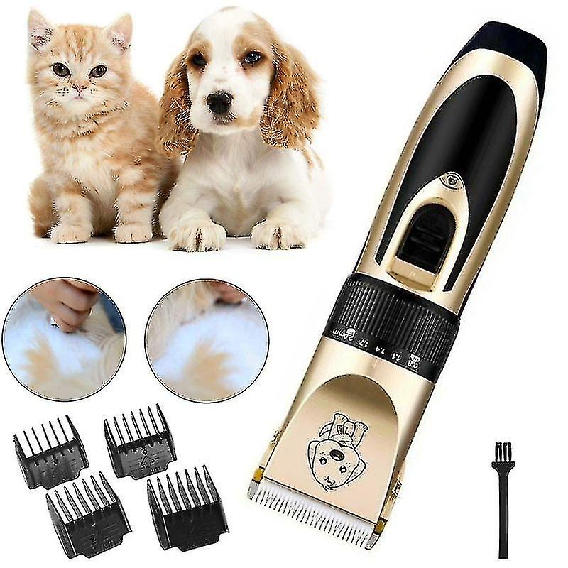 "Product parameters:Material: ABSColor: Champagne GoldSize: Comb 3/6/9/12mmCharging time: about 4-6 hoursPackage list: 1x hair clipper, 4x comb, 1x cleaning brushProduct Description:Ultra-quiet MotorThe dog grooming kit has a built-in ultra-quiet motor, the noise is less than 60 decibels, and does not produce huge noise, which can give pets a comfortable and pleasant haircut experience. The low-vibration and silent design can avoid scaring pets, reduce the resistance to haircuts, and make pets no longer afraid of haircuts.Wireless Design and Durable Battery LifeThis dog grooming clipper is cordless design, which can be used for haircutting work when fully charged, ensuring that you can use the haircutting scissors easily and freely, and get rid of the trouble of wires. Equipped with a USB cable, charging is safe and worry-free.Efficient and Safe TrimmingWith a powerful and efficient motor, you can trim pet hair quickly and efficiently; Equipped with an anti-allergic ceramic titanium alloy blade, which helps avoid pet skin allergies and will not pinch and hurt pet hair; Specially designed The 30 degree blade angle makes trimming more professional and safe.Adjustable TrimmingThe fine-tuning knob provides five levels of length (0.8-2mm), which can adjust the length precisely, allowing you to trim pet hair of different lengths. There are 4 styles of combs, including 3m, 6mm, 9mm, and 12mm. You can choose a suitable comb for trimming according to the thickness of your pet's hair. Multiple styles can be selected to meet the needs of different pets.Professional Pet Grooming KitThis grooming clipper contains: 1 Pet Trimmer with Anti-Allergy Ceramic Titanium Alloy Blades (Rechargeable Battery Included), 1 Cleaning Brush, 1 USB Cable, 4 Comb Attachments (3/ 6/9/12 mm)."