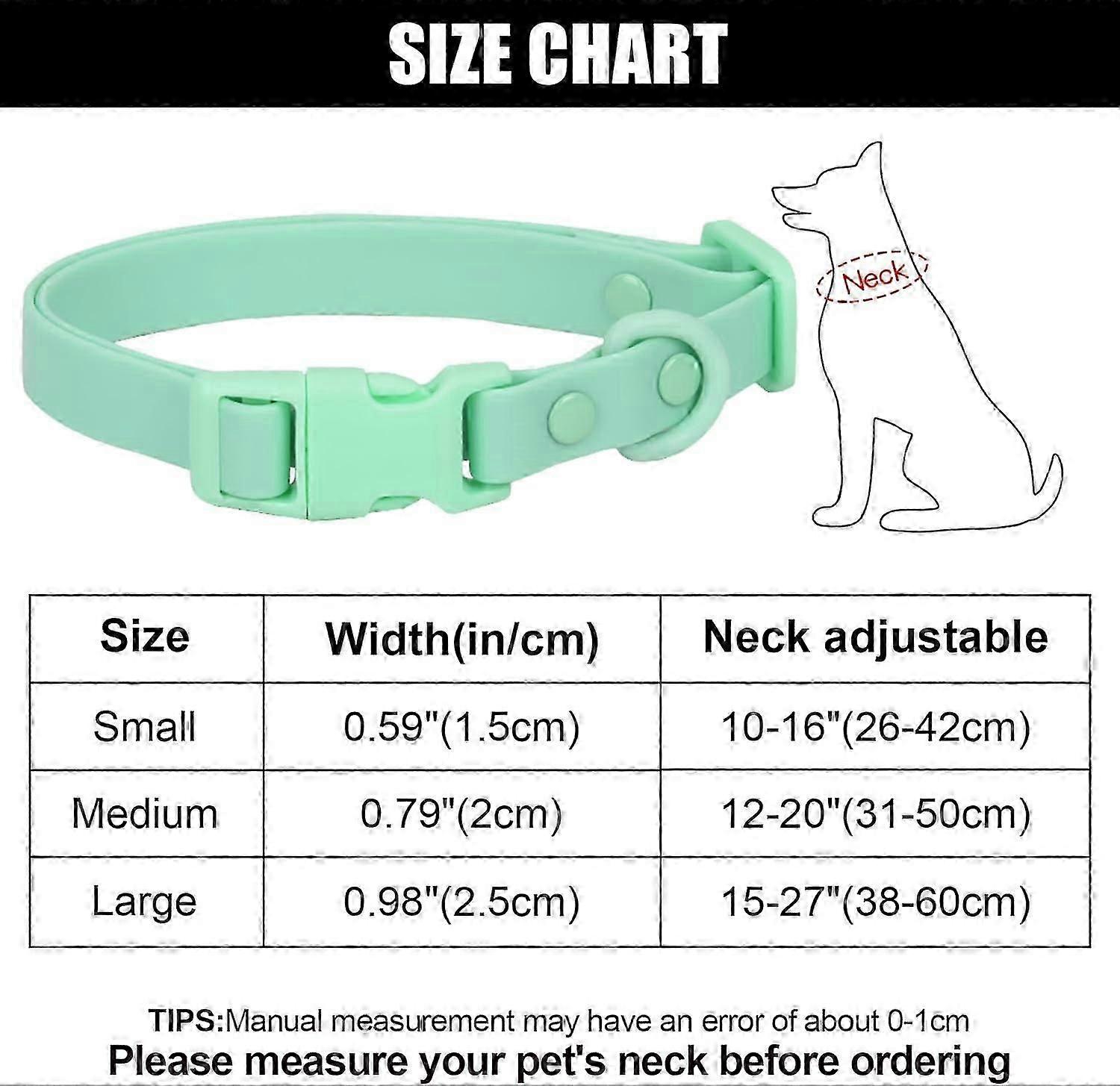 SAFETY MATERIAL: Waterproof dog collar made of high quality rubber coated webbing, soft and comfortable, with adjustable plastic buckle, safety buckle can be quickly and easily attached to the dog leash, upgraded plastic carabiners is strong and not easily deformed, this dog collar that makes the dog comfortable and free.MULTI-SIZE OPTIONS: The design of this dog collar is suitable for different types and sizes of dogs, available in 3 different adjustable sizes, S=10.2~16.5 inch, M=12.2~19.7 inch, L=14.9~23.6 inch, please measure your dog's neck size before choosing the size and check the sizing table.EXQUISITE DESIGN: Our soft collars are made of coated webbing wrapped in rubber, waterproof, and require only a damp paper wipe. Dazzling colors to play in the snow, pool, beach and other wet places, at now, surprise your dog.STYLISH COLORS: We will provide a variety of colors for you to choose, bright colors are more attractive, rubber leather is durable, not easy to break.EXQUISITE GIFT:Dog collar match good with any type of pet. For example, Cool dogs,Bulldog,American Bully, Pit Bull, Doberman, French Bulldog etc. The collar is suitable as a perfect gift for anniversaries, birthdays and other holidays.