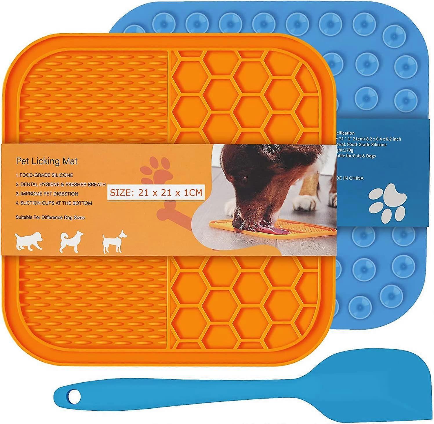 Safety Material - The Dog Lick Mat Is Made Of Silicone And Is Non-Toxic And Does Not Affect The Health Of Your Beloved Pet. Healthy Silicone Material, Safe, Non-Toxic, Durable, Soft, Bendable, Never Deformed And Easy To Carry.Convenient And Easy To Use - Before You Start Bathing/Sanding/Trimming/Grooming, Spread The Food Your Dog'S Favorite (Peanut Butter, Yogurt, Pumpkin Jam, Etc.) On Your Lick Pad, Then Stick It On Any Flat/Shiny Surface.Super Sucker - This Lick Pad For Dog Has 72 Small Suction Cups On The Back That Fit Perfectly On Smooth Surfaces Like Tub, Porcelain, Granite, Glass, And Tile. Avoid Falling Off The Wall Or Moving On The Floor.Promotes Healthy Feeding - Our Slow-Release Treatment Design Effectively Slows Pet'S Feeding Speed, Extends Feeding Time, Reduces Gas And Improves Digestion.Included In Delivery - You Get 2 Pieces Of Lick Mat, One In Blue, The Other In Orange With A Size Of 21 X 21, And 1 Piece Of Silicone Spatula.