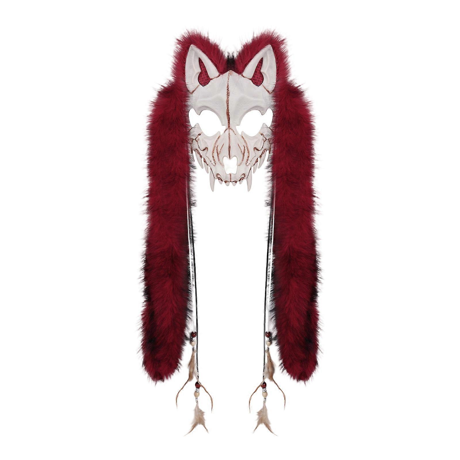 Werewolfs Mask Faux Furs Vikinges Foxes Mask Furry Animal Mask Halloween Cosplay Costume Accessory Wendigo Headdress Burgundy