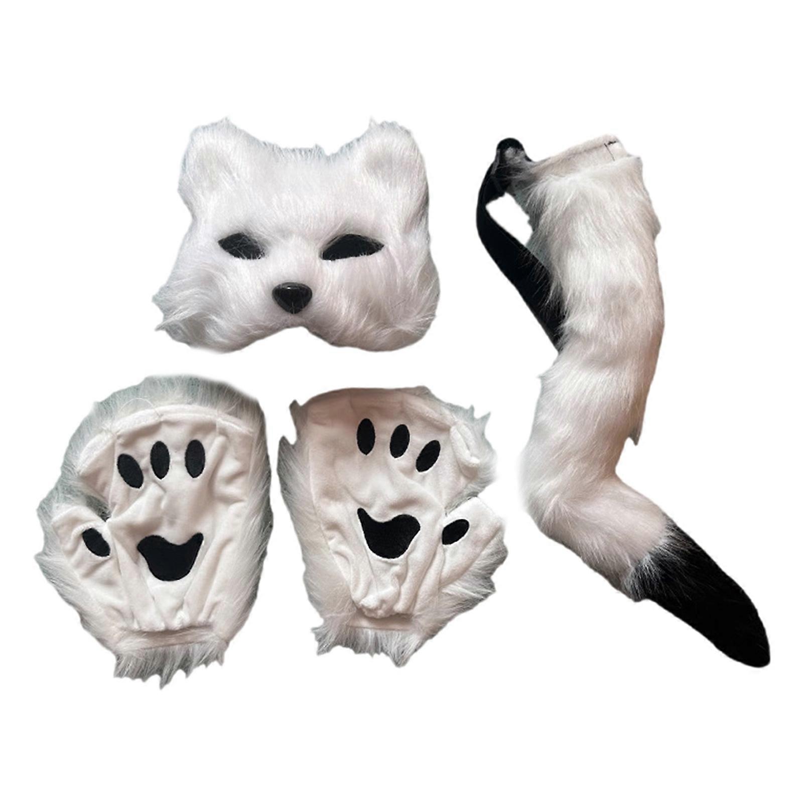 Cats Costume Accessories with Cats Mask Paws Gloves Cats Tail Animal Cosplay Costumes for Halloween Christmas Party White