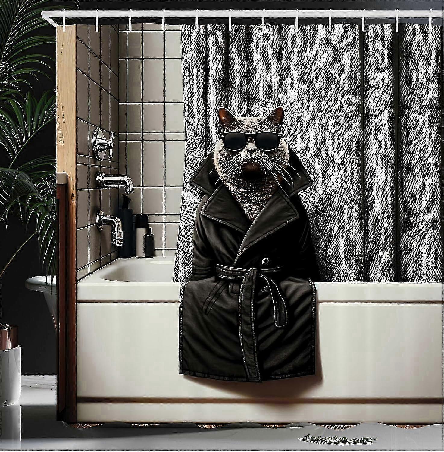 Cat Shower Curtain, Realistic Funny Mysterious Kitty in Human Coat and Black Shades in Bath Tub, Cloth Fabric Bathroom Decor Set with Hooks,Grey and C