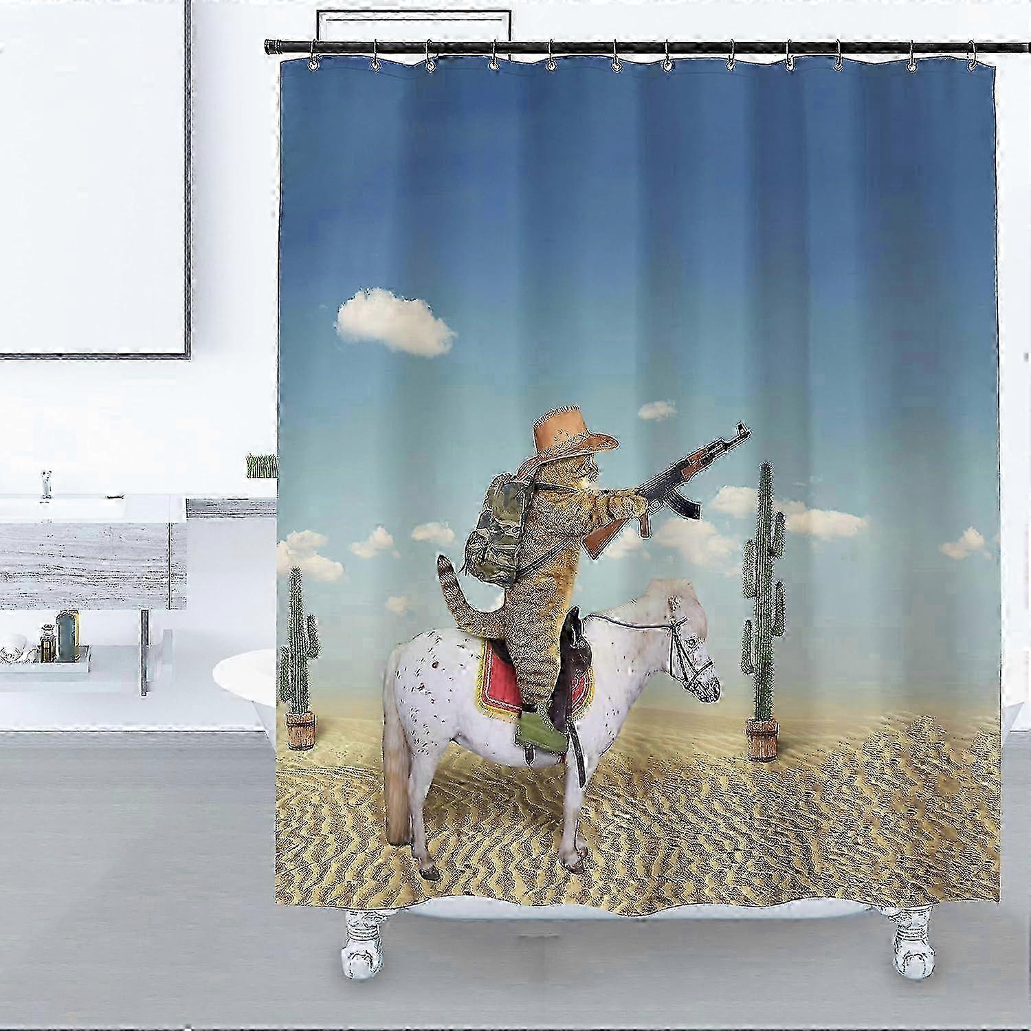 Cat Shower Curtain Cute Funny Cowboy Cat Riding Horse in The Desert Bathroom Shower Curtains Polyester Fabric Waterproof with 12Hooks