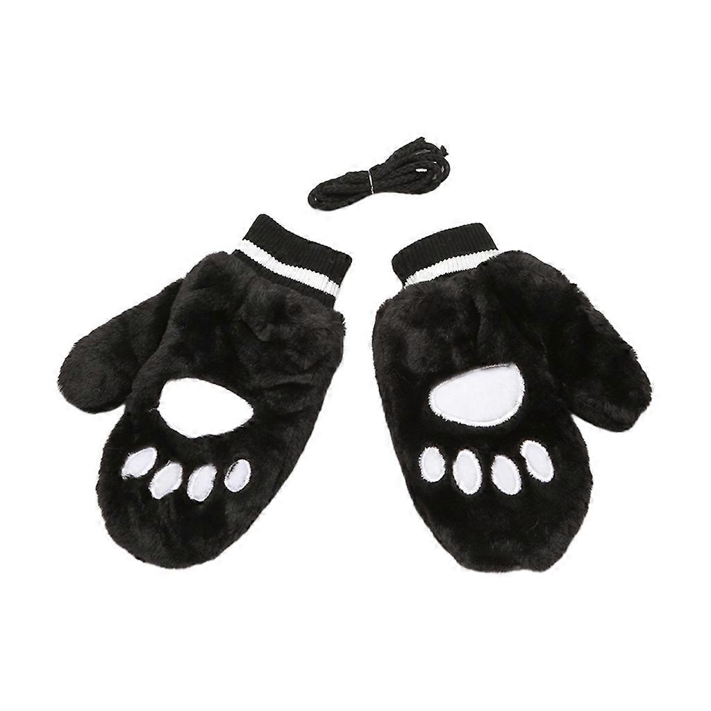 Lovely Plush for Cat Claw Mitten Cartoon Kitten Paw Gloves with Rope Halloween Cosplay Full Finger Gloves Party Dress up Black