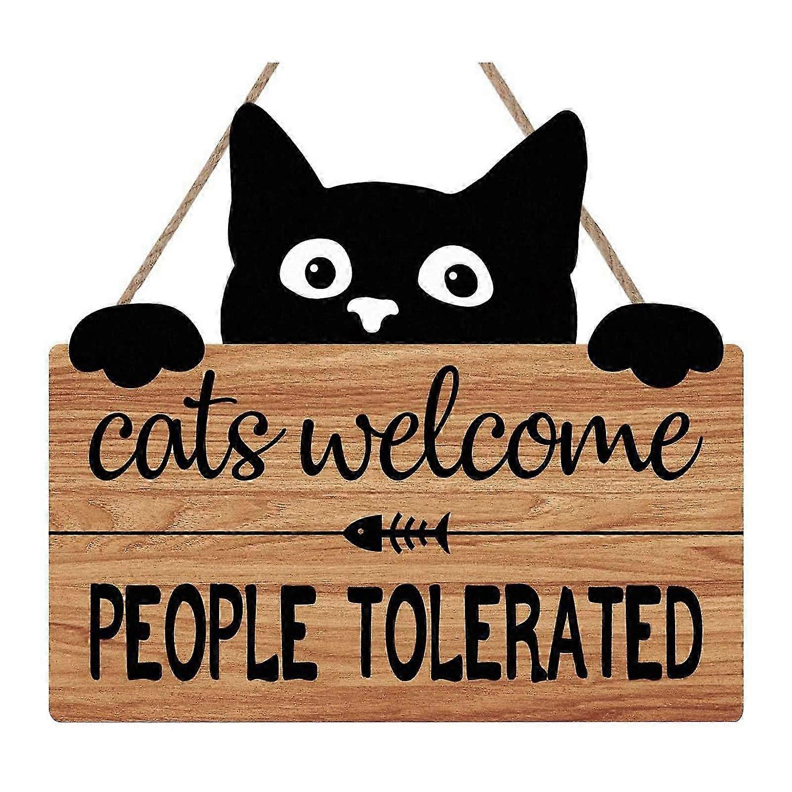 Cat Welcome People Tolerated Sign Front Door Wall Hanging Wooden Plaque Hanger Black Kitten Doorplate Decoration Festival Present Jikaix