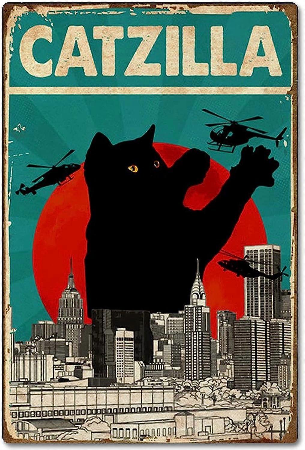 Cat Catzilla Metal Tin Sign, Retro Poster Cafe Bar Pub Beer Club Wall Plaque Home Decor Poster Painting 8x12 inch