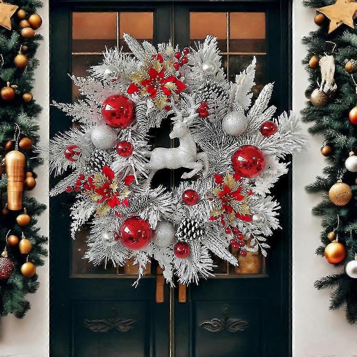 Christmas Wreath For Front Door Christmas Reindeer Wreath With Christmas Poinsettia Flower Christmas Decorations White Wreath Winter Wreath Indoo