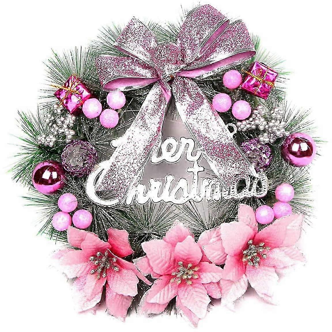 Christmas Wreath for Front Door, 30cm Pink Winter Artificial Garland with Bow & Flowers