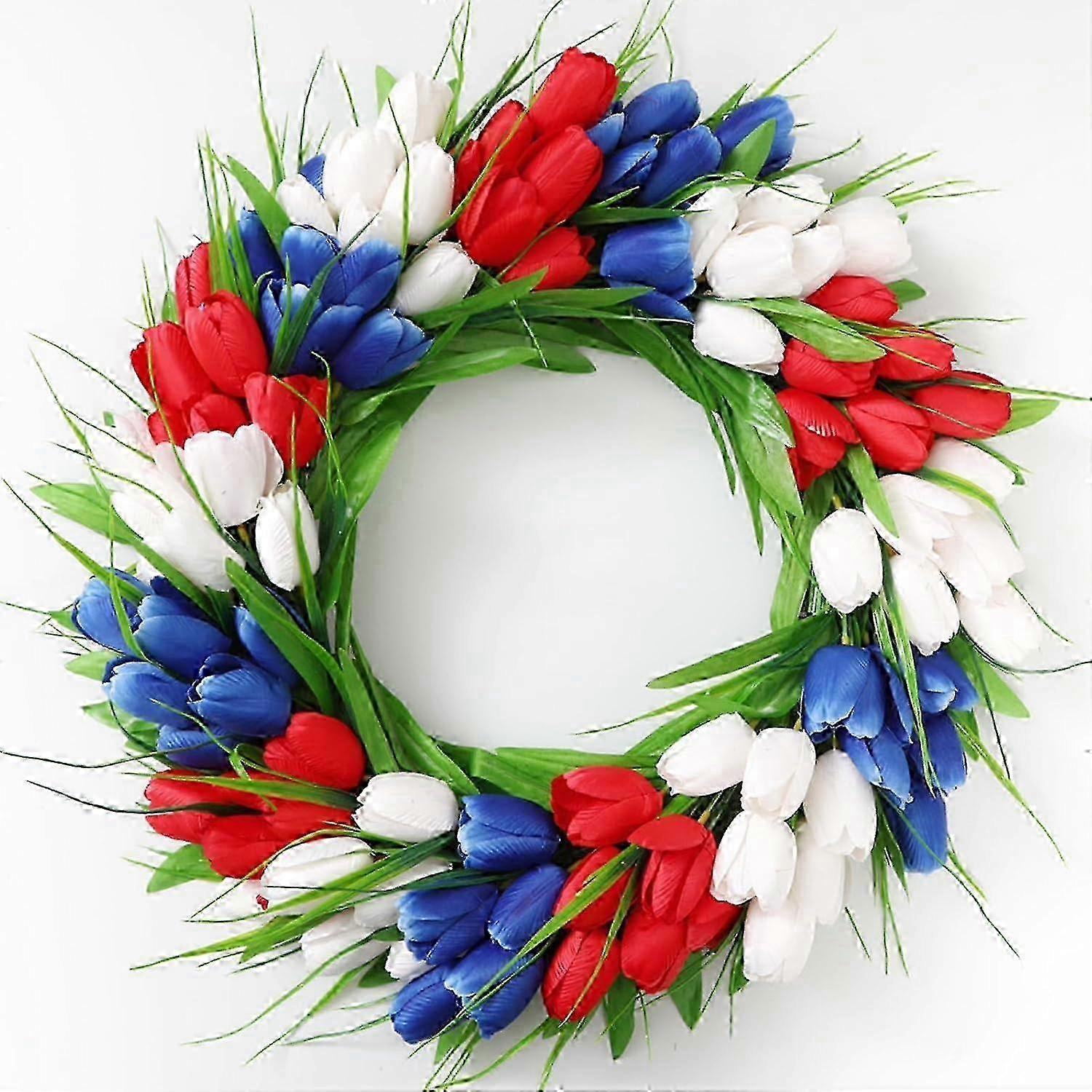 16 Inch Tulip Wreath for Front Door,Spring Artificial Tulip Summer Wreath for Windows Walls Outdoor Indoor Home Decor (Red Blue White)