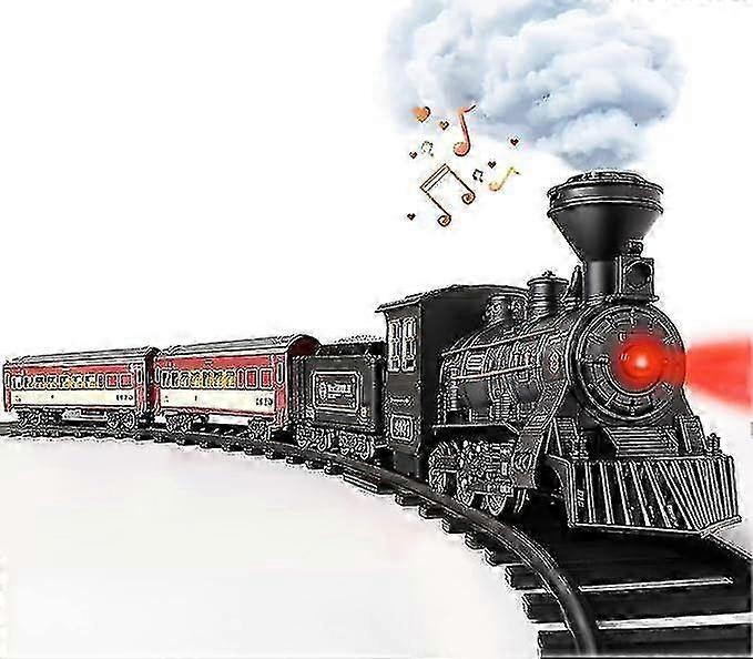 describe:1. [Upgraded USB rechargeable metal train set]: This electric train set is equipped with an all-alloy steam train, 1 coal carriage, 2 lighted passenger cars, 1 cargo carriage, 8 curved tracks, 8 straight tracks, 4 Y-shaped tracks, 1 cross track and 60 track locks. Unlike other train toys on the market, our train toys come with a 1000mAh/3.7V rechargeable lithium battery and USB charging cable as well as realistic light carriages. Once fully charged, your child can enjoy hours of fun travel.2. [Lighting carriage & multi-functional locomotive]: Our Christmas train restores all the details of the real train. The detailed locomotive emits a whistle and lights, and the toy train also comes with an empty water bottle and adding water to the tank creates smoke. In addition, the two passenger compartments also have lighting functions. Turn on the bottom switch and warm light fills the entire car. This makes the model train toy more realistic when driving at night.3. [Alloy Material, Safe and Durable]: The motorcycle steam and wheels are made of alloy material, which is non-toxic and tasteless. Each component undergoes strict quality control and is safe enough for children. Compared to plastic trains on Amazon, our alloy trains are more durable and impact resistant. The Christmas tree train's sleek design feels good to the touch and won't hurt your child's hands or body. You can play with your children with confidence.4. [More track types, more fun]: The Christmas train set only needs to assemble the rails into various shapes (circle, oval, luxury layout), each electric train track is firmly locked, and then Turn on the switch and the Christmas tree train set will move smoothly on the toy track. DIY train sets for boys ages 4-7 can improve your child's hands-on and thinking skills. If parents assemble this electric train with their children, it can also enhance the parent-child relationship.5.Perfect Christmas Toy Gift for Children: The perfect Christmas tree train set with Christmas element puzzles, suitable for decoration under the Christmas tree, allowing children and family to spend a wonderful Christmas time together. A toy train set makes a fun and educational holiday, birthday and Christmas gift for every kid. Toy train model for boys/girls ages 3, 4, 5, 6, 7, 8+. Let your children get double the joy from you Specification:Colour: BlackDimensions: 71 inches (length) x 31 inches (width)Material: ABSBattery: 1000mAh/3.7V rechargeable lithium battery and USB charging cablePackage includes:Alloy smoking front end*1 Passenger compartment*2 Loading compartment*1 Tree*2Charcoal car*1 Villa garage*1 Convenience store*1 Traffic sign*4Sign*3 Track*1 Straight track*8 Y-shaped track*4 Curved track*8 Water bottle*1Scenery cards*3 Character cards*4 Traffic signs*3USB data cable*1 Note: Due to the light and screen setting difference, the item's color may be slightly different from the pictures. Please allow slight dimension difference due to different manual measurement. Sold by-Dadangjia