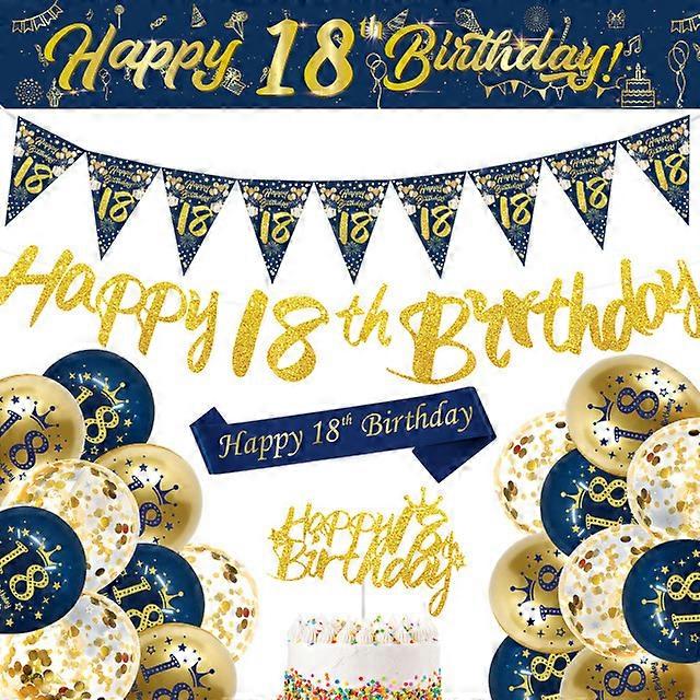 18th Birthday Decorations for Boys Girls, Blue Gold Happy 18th Birthday Banner, 18th Birthday Latex Balloons, Bunting Flags, Sash, Cake Toppers, 18th