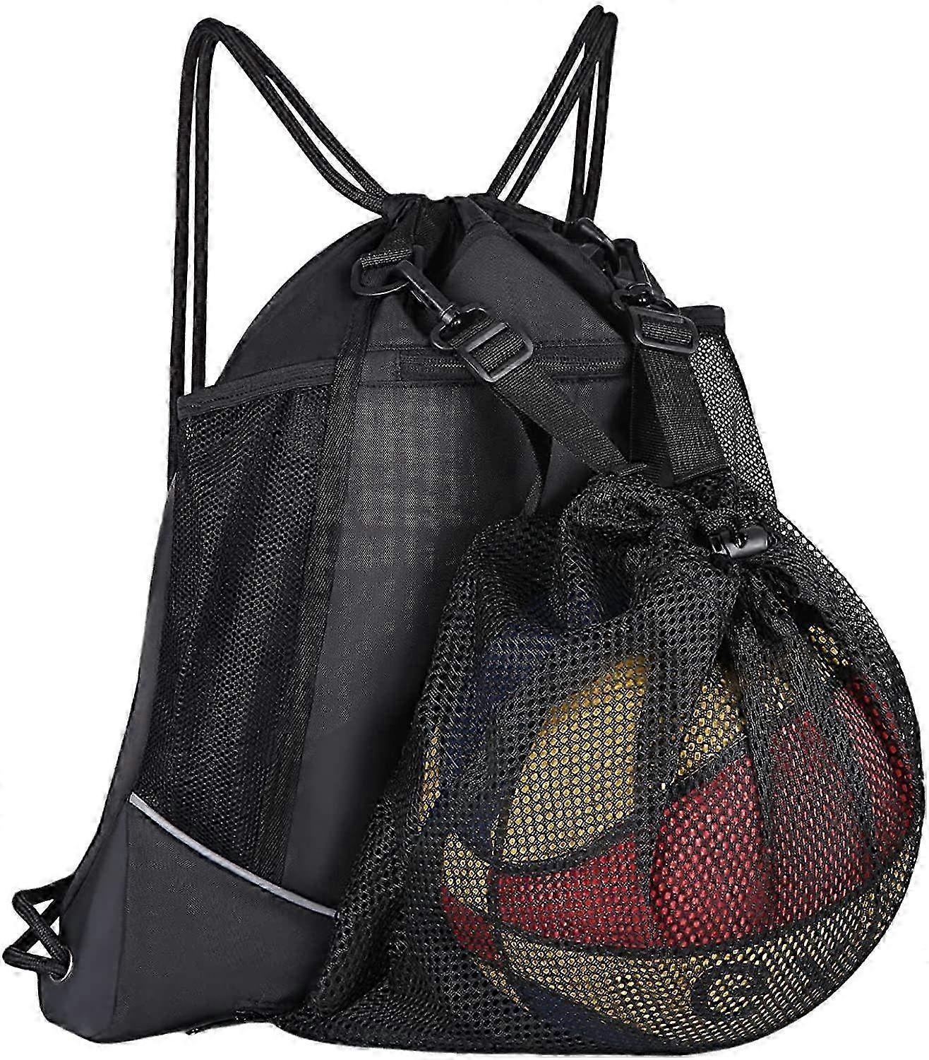 Material: polyester + mesh, Size: bottom width 41cm, height 47cm, side width 7cm, With front zipper bag, inner pouch, side mesh bag, front zipper with hidden mesh pocket, for placing basketball, football, etc. High quality material: made of high quality nylon and the mesh bag is made of polyester, portable, comfortable and durable. The drawstrings, which are made of super comfortable polyester, can prevent digging into the shoulders and help reduce your shoulder strain, so this drawstring bag is very convenient to use Widely used: suitable ball for gym, yoga, hiking, camping and other outdoor activities. The football backpack can hold some portal electronics and all kinds of small sports equipment. The mesh bag can carry many kinds of balls such as basketball, football, volleyball, etc Closure: Drawstring Rucksack Fold Away Net: The net ball bag with drawstring can be removed when you need it, or put it back in the zip pocket when not in use. It fits a full size football, basketball, baseball helmet or whatever you or your kids need to play. The mesh pocket is attached to the backpack with 2 buttons LARGE EASY OPEN DRAWSTRING BAG - The main bag is large enough to hold everything from lunch to your trainers, cleat shoes or other gear. Front zip compartments: in addition to the main pockets and a drawstring pocket, there are 2 zip pockets and 2 side mesh pockets. The zipper compartments are convenient to keep the safety of your personal belongings, clean and organized. 2 side mesh pockets for water bottles, basketball rackets, umbrellas or whatever you want to hold them.