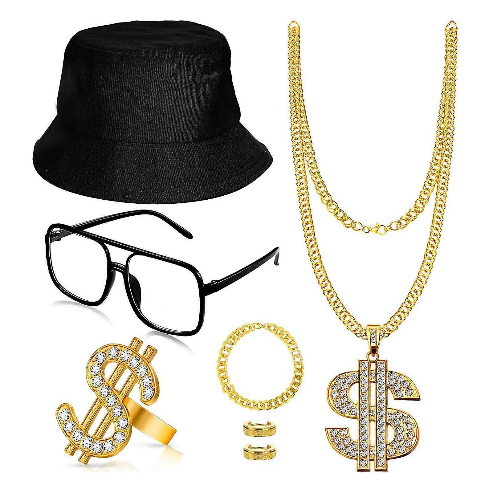 Men Hip Hop Punk with Necklace Dollar Sign Rings Earrings Glasses and Bracelets for Men Women 1980s Party and Halloween