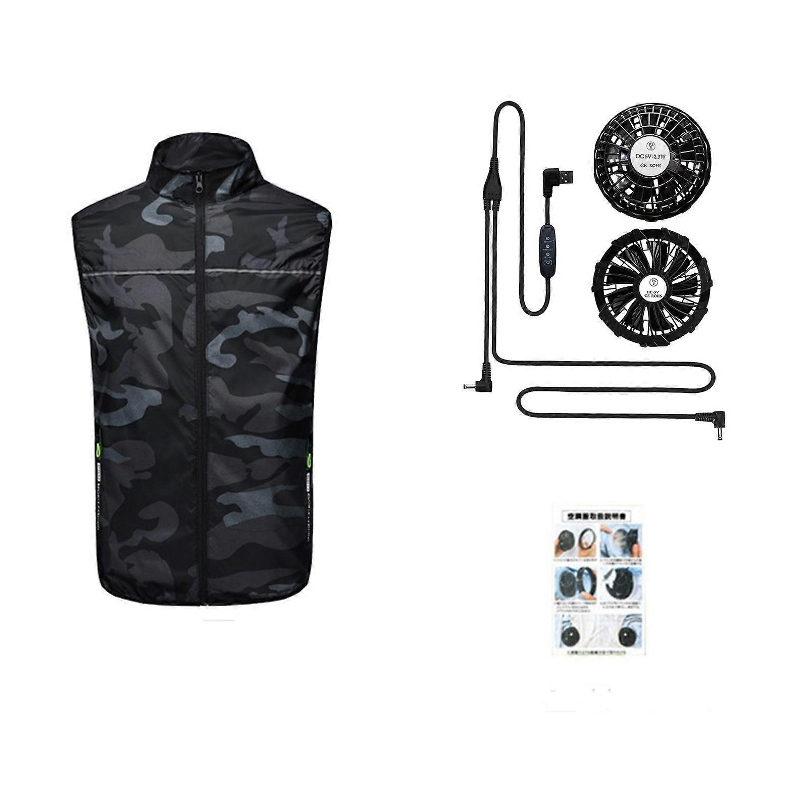 ["Description: \n\nFeatures:\nbrand new and high quality\nSleeveless cooling vest for jacket, stand collar, solid color/camouflage optional, two side zipper pockets, zipper closure on front.(The waistcoat has pockets for fans.)\nThe fan has 3 levels of wind speed adjustable, press the button to start, bring enough cool breeze for the hot summer days.\nTwo fans with twice the air volume, providing for stronger wind. It can promote the evaporation of sweat and effectively reduce the body temperature.\nMade of high quality chemical fiber blended material, fast drying, for sun for protection, breathability, abrasion resistance light weight and comfortable.\nSuitable for summer running, hiking, camping, cycling, fishing. As a summer outfit and heat-resistant clothing.\nEasily remove the fan: just twist it to remove the fan, and then wash the vest with soapy water. Suitable for both men and women.\n\nSpecification:\nMaterial: Chemical Fiber Blended\nWaistcoat Color: Gray/Camouflage(optional)\nPower Bank Capacity: 5V, 10000mA\nOptional Style: 1, 2, 3, 4, 5\nStyle 1: 1 x Gray Cooling Vest Only(has pocket for fan)\nStyle 2: 1 x Camo Cooling Vest Only(has pocket for fan)\nStyle 3: 1 x Gray Cooling Vest + 2 x Fans\nStyle 4: 1 x Camo Cooling Vest + 2 x Fans\nStyle 5: 1 x 5V 10000mA Power Charger\nSize: S/for M/L/XL/2XL(Chinese Size,follow the size chart to select please)\nSize:S\tLength:63cm(24.8inch)\tShoulder:41cm(16.14inch)\tBust:112cm(44.09inch)\tRecommended Height:155cm-165cm(61.02inch-64.96inch)\tRecommended Weight:40kg-55kg\nSize:M\tLength:65cm(25.59inch)\tShoulder:43cm(16.92inch)\tBust:116cm(45.66inch)\tRecommended Height:160cm-170cm(62.99inch-66.92inch)\tRecommended Weight:52.5kg-67.5kg\nSize:L\tLength:67cm(26.37inch)\tShoulder:44cm(17.32inch)\tBust:120cm(47.24inch)\tRecommended Height:165cm-175cm(64.96inch-68.89inch)\tRecommended Weight:65kg-75kg\nSize:XL\tLength:69cm(27.16inch)\tShoulder:46cm(18.11inch)\tBust:124cm(48.81inch)\tRecommended Height:170cm-180cm(66.92inch-70.86inch)\tRecommended Weight:72.5kg-82.5kg\nSize:2XL\tLength:71cm(27.95inch)\tShoulder:47cm(18.50inch)\tBust:128cm(50.39inch)\tRecommended Height:175cm-185cm(68.89inch-72.83inch)\tRecommended Weight:80kg-90kg\nQuantity: 1 set\n\nWarm prompt:\n1.Asian people size is 1 or 2 sizes smaller than European and American.\n2.Please note that low temperature washed,do not bleach and place under the blazing for sun for quite a long for time.\n3.As different measuring methods,it will occur 1-3 for cm deviation about the items,please ensure that it is okay for you before ordering.\n4.Because of different monitors and lamplight,the picture may not reflect the actual color of the item,really thank you for your kind understanding!\n            \nPackage includes:\nStyle 1: 1 x Gray Cooling Vest Only(has pocket for fan)\nStyle 2: 1 x Camo Cooling Vest Only(has pocket for fan)\nStyle 3: 1 x Gray Cooling Vest + 2 x Fans\nStyle 4: 1 x Camo Cooling Vest + 2 x Fans\nStyle 5: 1 x 5V 10000mA Power Charger\n(without retail package)"]