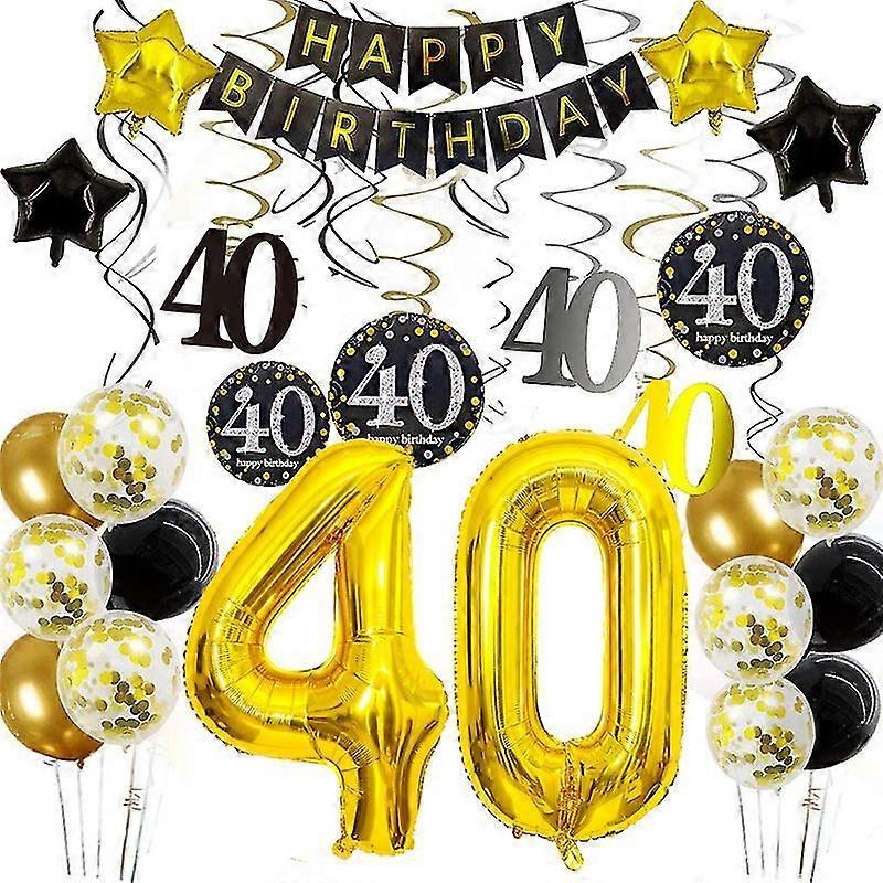 Birthday Decorations for Men: 1pcs happy birthday banner, 20pcs 12" balloon (10black, 10gold), 8pcs 12" gold confetti balloon, 4pcs 18" gold star foil balloon, 1pcs 40" number "40" foil balloon, 12pcs swirls streamers (3gold, 3gray, 6black), 1pcs 32.8ft gold ribbon, 1pcs tying tool, 1pcs 100-point glue. A Great Gift for Your Lover: The 40th birthday decorations kit is suitable for men and women. The design on different color balloons are prepared carefully, just for celebrating the special and only day in your life. The black and gold 40th birthday balloons decorations also choose the relevant color and number, constructing happy atmosphere, leaving you a unforgettable memory. Reusable & Sturdy: All of black and gold party decorations are made of high-quality materials and can be safely used around children. This high quality 40th birthday decorations for men can be used in many times. 40th birthday balloons kit is sturdy enough to stand the long-hour display. Save Time: The 40th black and gold birthday decorations are very complete, which include everything you need for a fantastic black and gold themed party. You don't waste more time, energy and money to rematch. This black and gold party decorations set is a convenient and practical way of making sure you have everything you need. Versatile Decor: Our black and gold balloons set can add-on to 40th birthday party decorations, 40 anniversary decorations for party, 40 wedding anniversary party, beach party, holidays or even use it as a home/office adornment ideal addition to decorate in a room, hall, garden, beach party, office, or to your home.Warm Notes:1. When you inflate your balloon, be gentle and slowly. Too much air will make the balloon burst.2. Choking hazardChildren under 8 years old can choke on not inflated or broken surprise balloons3. The latex balloons and foil balloons will float in the air only with pure helium.If you just use the air to inflate the happy birthday balloons, the balloon will only expand, rather than inflate.4. Please tighten the ribbons. If the ribbon is too loose, the balloons will also air leak quickly.5. When you inflate Confetti Balloon, you can use the dry duster cloth to rub the surface of balloon, the inner scraps of paper will stick to the balloon.