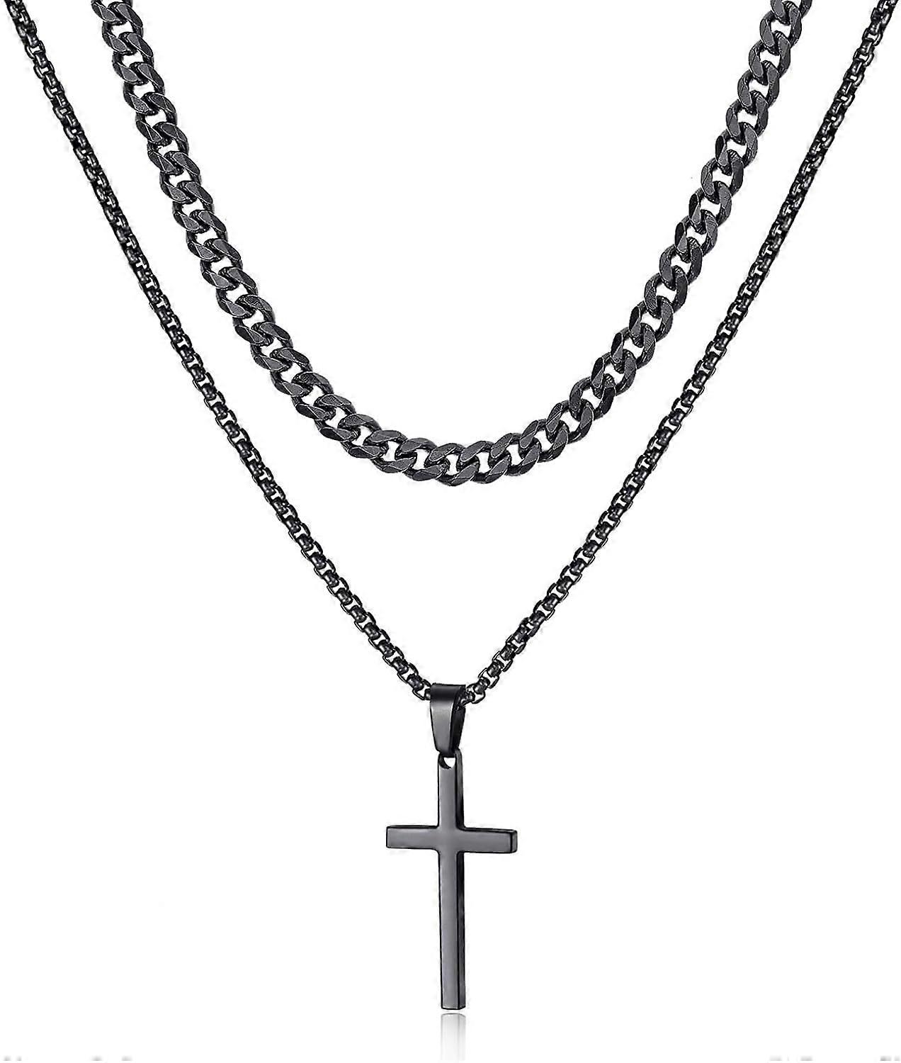 Cross Necklace for Men,Gold Black Silver Stainless Steel Layered Cross Pendant Necklace Jewelry Gifts Cuban Chain Box Chain Necklace for Men Women Boy