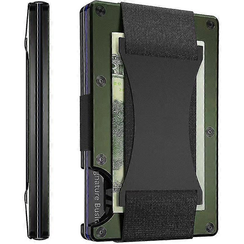 Slim Wallet For Men - RFID Blocking Front Pocket Credit Card Holder - Aluminum Metal Small Mens Wallets with Cash StrapGreen RFID BLOCKING Breathe easy because your cards will be surrounded by the metal body of this wallet protecting them from even the most powerful RFID Chip Readers. FUNCTIONAL SLIM Holds 1-12 cards without stretching out. The slim wallet is ideal for carrying business cards, credit and debit cards, bills etc. The outside notch allows you to push out the cards easily. INTEGRATED CASH STRAP The cash strap allows you to secure several bills to the outside of your wallet with a proprietary plated-elastic design. The metal plate is designed for enhanced security and aesthetic. See our other listing for options with the Money Clip.