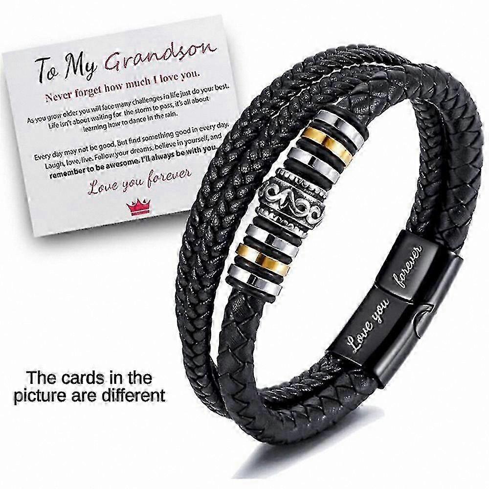 Product Name: Bracelet Material: Stainless Steel Style: Men's Shape: Geometric Design: Fresh and Sweet Length: 22CM / 21CM / 20CM / 19CM Features: 1. Suitable for adult men or younger men 2. Comes with a message card for a thoughtful touch 3. Surprise your son with this braided leather bracelet 4. Smooth leather surface, excellent feel and comfortable to wear 5. Magnetic buckle for convenient and easy wear 6. A meaningful gift that will be cherished 7. Ideal for men, boys, and teenagers 8. Can be used as everyday jewelry Package Included: 1 x Bracelet