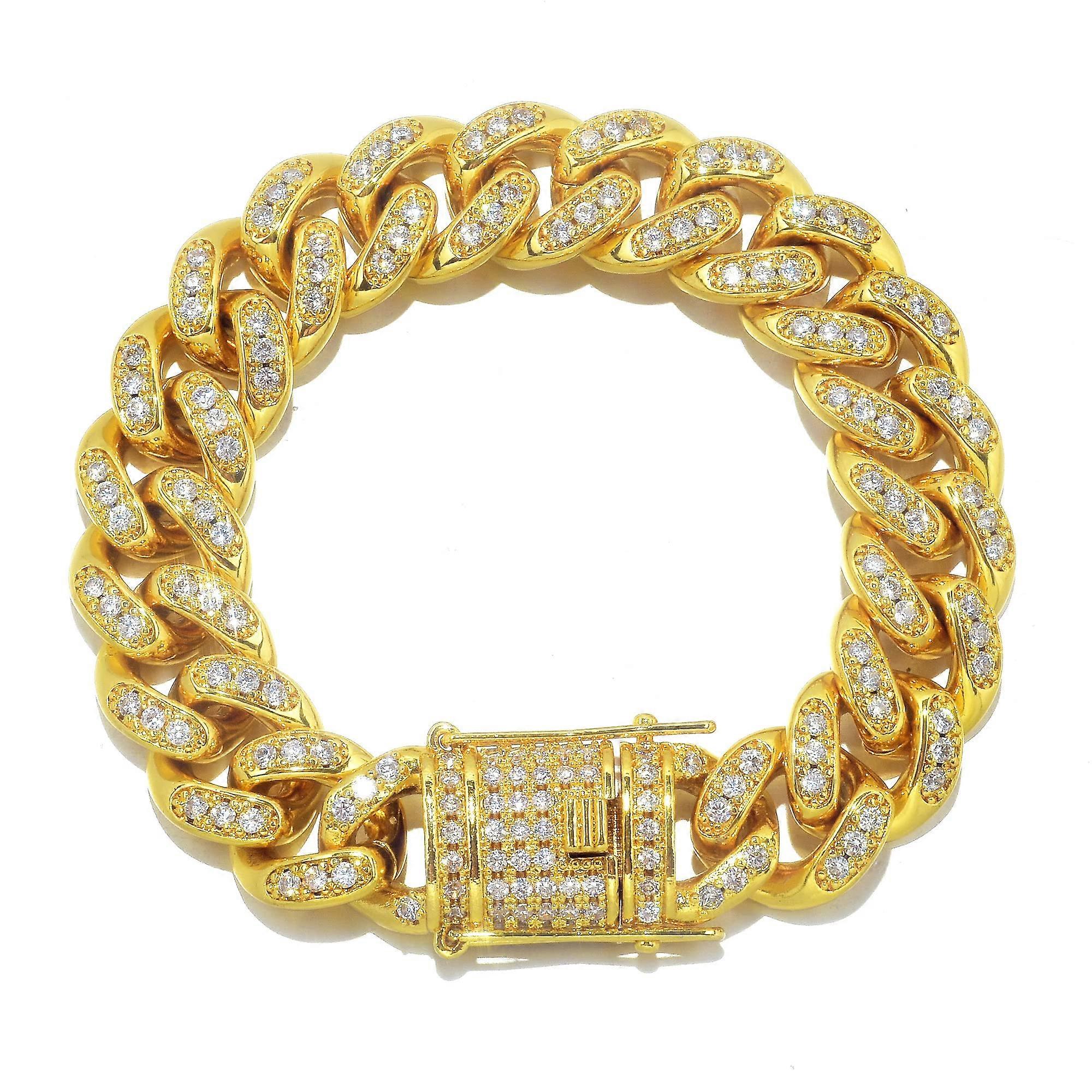Men's Miami Cuban Link Chain 18K Gold 14mm Stainless Steel and Brass Curb Bracelet Necklace with Zirconia Inlaid Full Diamonds