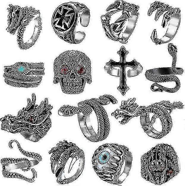 Vintage Gothic Punk Ring Set - One order includes 9-18 Gothic Punk Rings, all different styles of Vintage Punk Rings. Including Chinese dragon ring, claw ring, snake ring, skull ring, devil's eye ring, octopus ring, skeleton feather and other shapes,to meet your different needs and matching.PREMIUM MATERIALS--These vintage rings are made of alloy and are comfortable to wear and easy to put on and take off. The average size fits most people's fingers, and the single ring is adjustable without worrying about size. Retro Style. Add points toyour overall look.GOOD ACCESSORIES - These vintage animal ring sets are available in black and silver, and it's a retro punk style. Choose from many types of cool anime rings to match with your everyday outfits or for special occasions, these rings will make you look cooland be able to express your personality.MULTIPLE APPLICATIONS -- Our men's rings are cool clothing accessories. A simple piece that will accentuate your day and night style, this ring is easy to wear from casual to formal. Punk gothic style can better express your attitude towards life. Punkoctopus rings can be worn on various occasions, such as themed parties, everyday wear, dates or to complete your everyday style; anniversary gifts are also a good choice for friends and family.