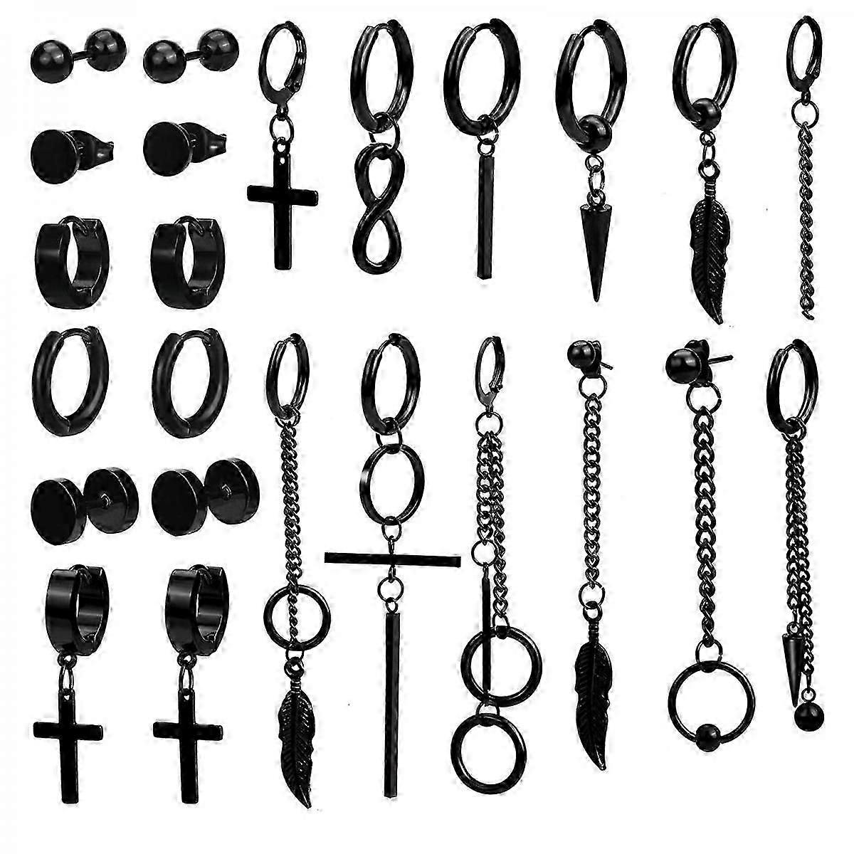 24 Pcs Black Earrings for Men Black Stud Earrings Mens Earrings Stainless Steel Dangle Hoop Earrings for Men Women Fashion