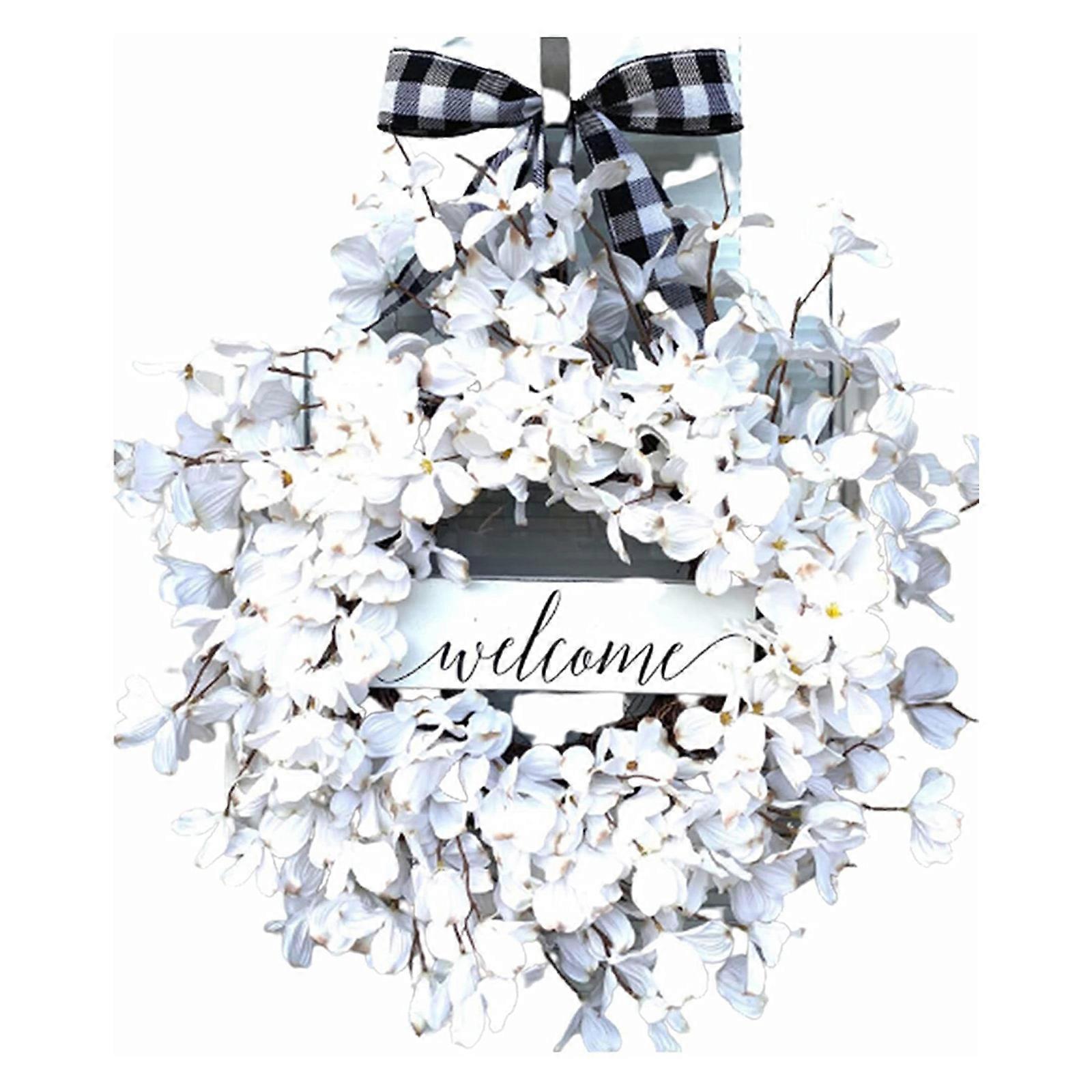 White Dogwood Wreath Artificial Plaid Bowknot Hanging Garland Ornament for Wedding Farmhouse Front Door Wall Decoration Supplies