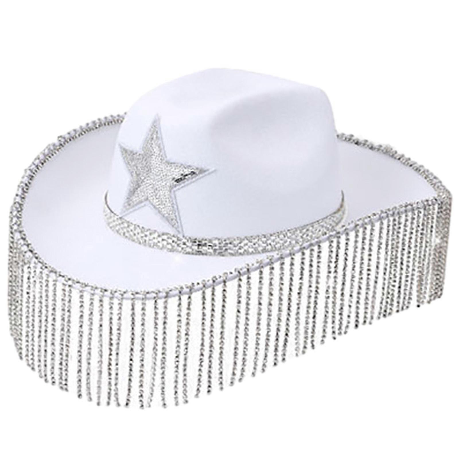Eye Catching Cowboy Hats with Diamond Fringes Carnivals Role Party Cowgirl Hat Sunproof Wide Brims Disco Party Felts Hat White