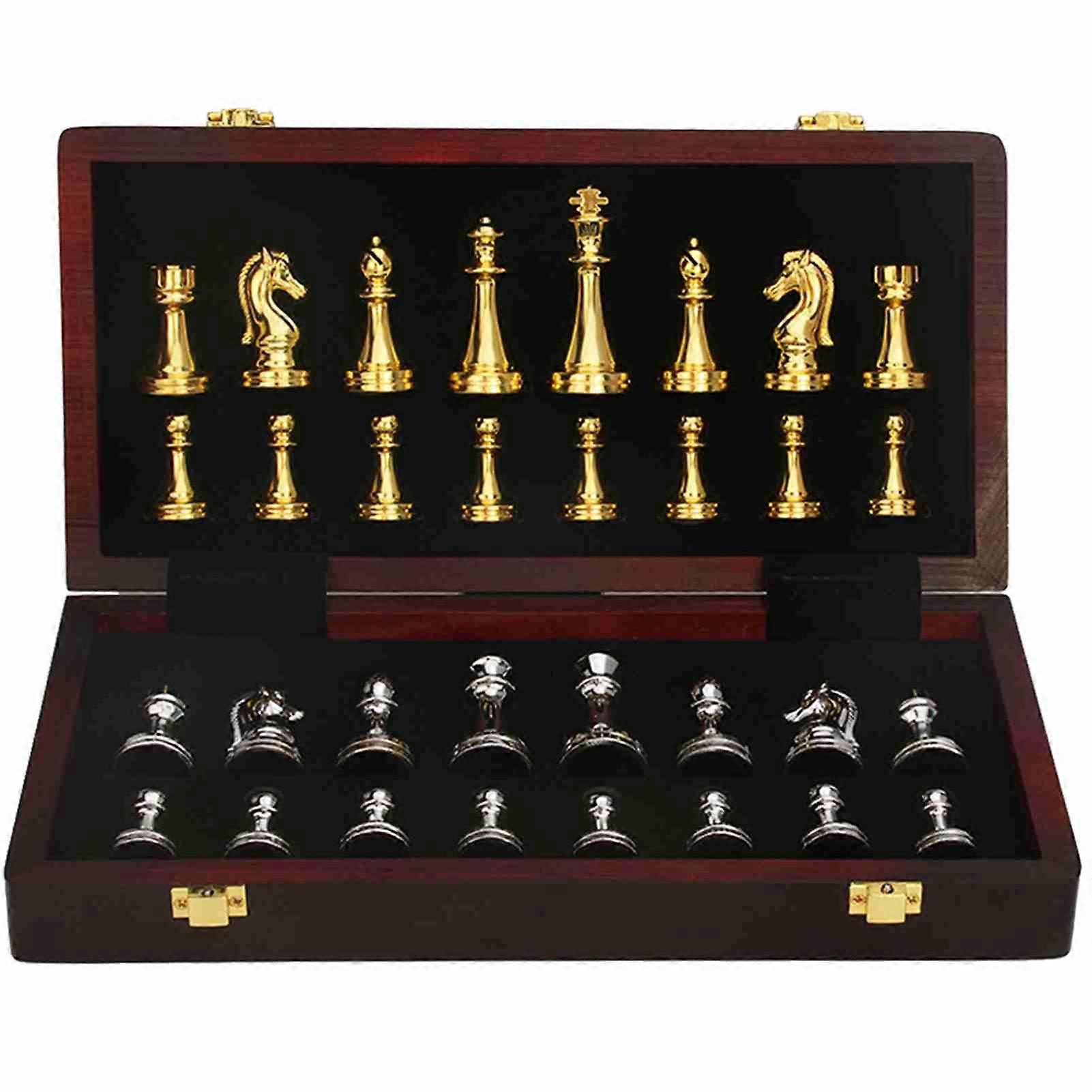 Magnetic Travel Chess Set Gold Silver Metal Chess Pieces Folding Wooden Chess Board