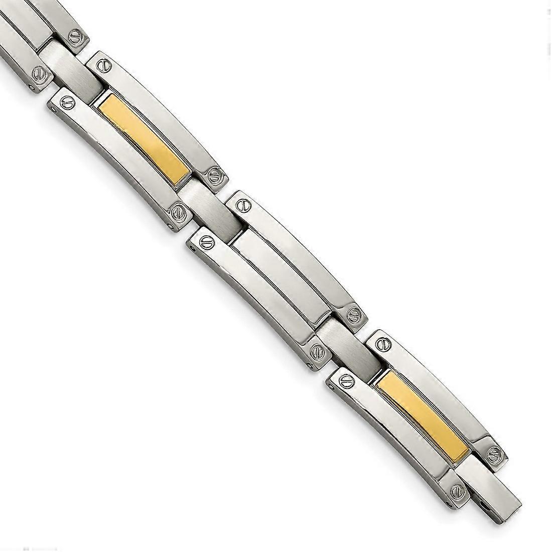 Stainless Steel Polished 14k Gold Bracelet - 8.5 Inch - Measures 9mm Wide - In Solid Stainless Steel 43.7 Grams - Product Attributes: - Fold-over - - Width of Item: 9 mm - Length of Item: 8.5 in - Chain Length: 8.5 in - Chain Width: 9 mm - Clasp /Connector: Fold Over Catch - Finish: Polished - Chain Type: Link-Other -