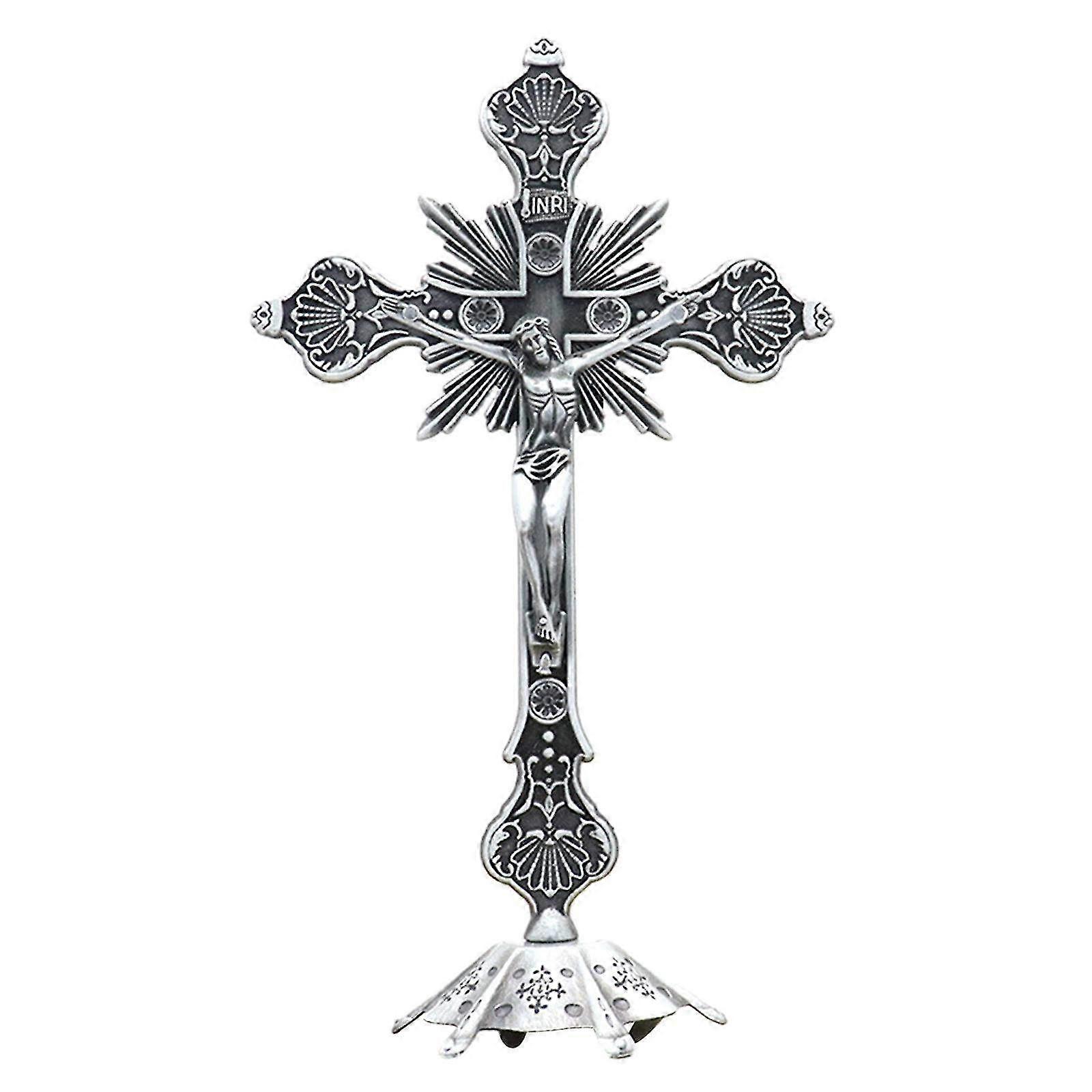Description: Crucifix Ornament SizeStanding Crucifix measures approx. Height is 25.5cm or 10.04inch, an appropriate size for tabletop decorations.Detachable BaseThe metal alloy cross is threaded to the base for easy installation and can be removed from the base.Jesus Desktop OrnamentThe cross ornament can be decorated in the living room, church, or bedroom, placed on the tabletop, fireplace, shelf, etc.Religious DecorationThis Standing Crucifix for the table has the unique appearance of a crucifix and is full of Christians.Religious GiftsThe cross represents