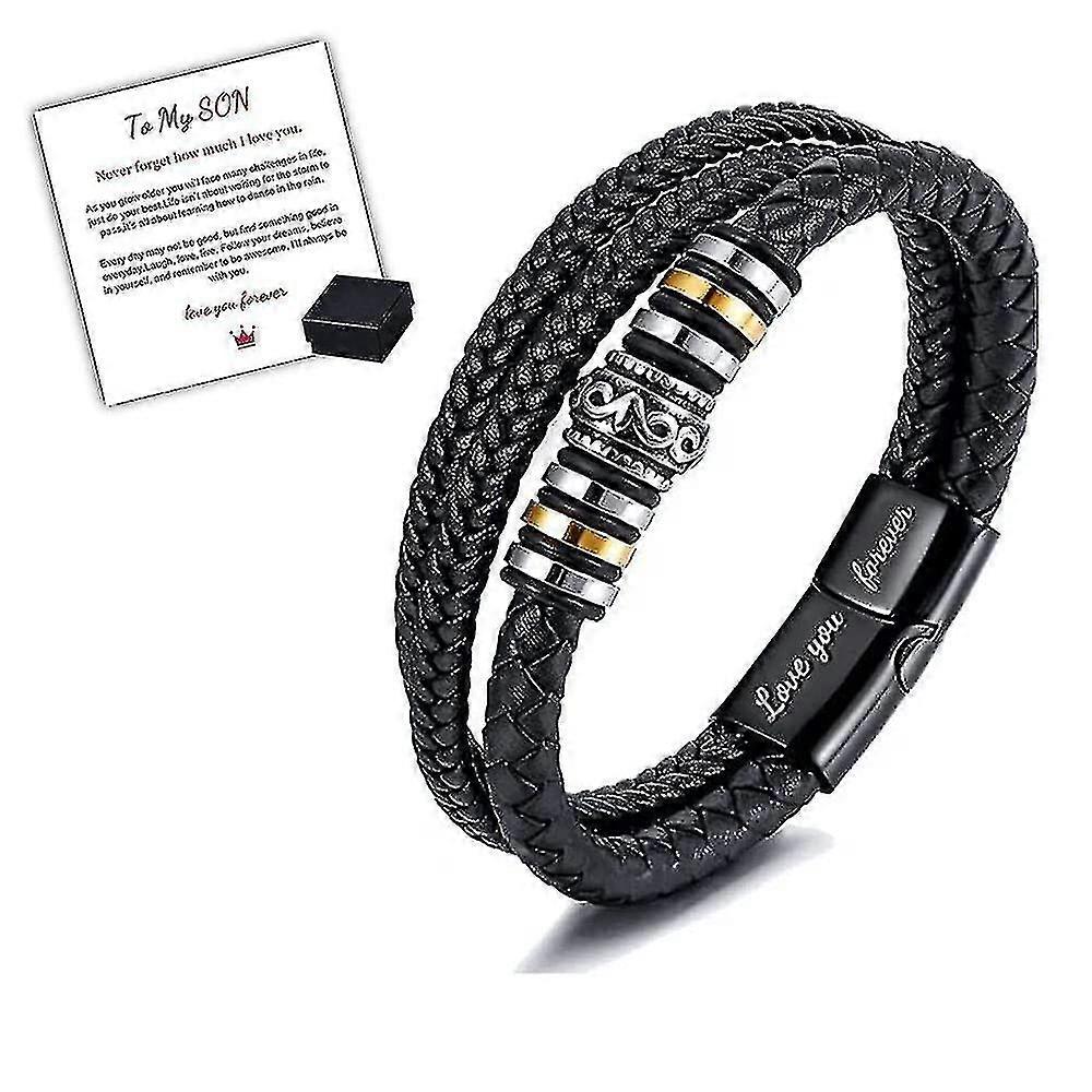 Gift for Son: To my son braided leather bracelet, "mother and son forever linked together" braided leather bracelet" Surprise your son with this braided leather bracelet. Follow your dreams, believe in yourself, and remember that i love you forever.With Love Message: It bracelet for son from mother comes in a box with a love message, which would even make this gift more romantic and thoughtful. Surprise your son with this Braided Leather Bracelet.Love You Forever: A jewelry with a message symbolizes your special love. This will be a meaningful gift cherished by the person you love forever. The Wonderful gift for your son Also, it can be a special gift just for yourselfComfortable Material: Hand-woven black bracelet made of made of high-quality Genuine Leather and stainless steel, purely handmade tightly woven bracelet with a special stainless steel magnetic clasp, soft and comfortable touch feeling.Perfect Gift: The inspirational bracelet is the wonderful gift for your son/grandson, you can give this leather bracelet for men as a graduation, christmas, thanksgiving day, birthday and casual gift to your son/grandson or someone you love forever. It can also be a special gift just for yourself.