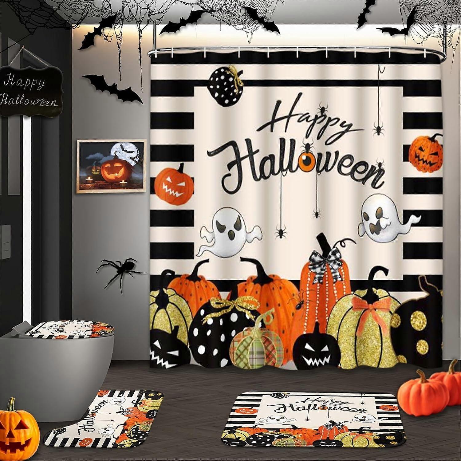 Autumn Shower Curtain Set 4 Pcs - Orange Maple Leaves Design, Includes Toilet Cover & Non-Slip Rugs for Bathroom Decor