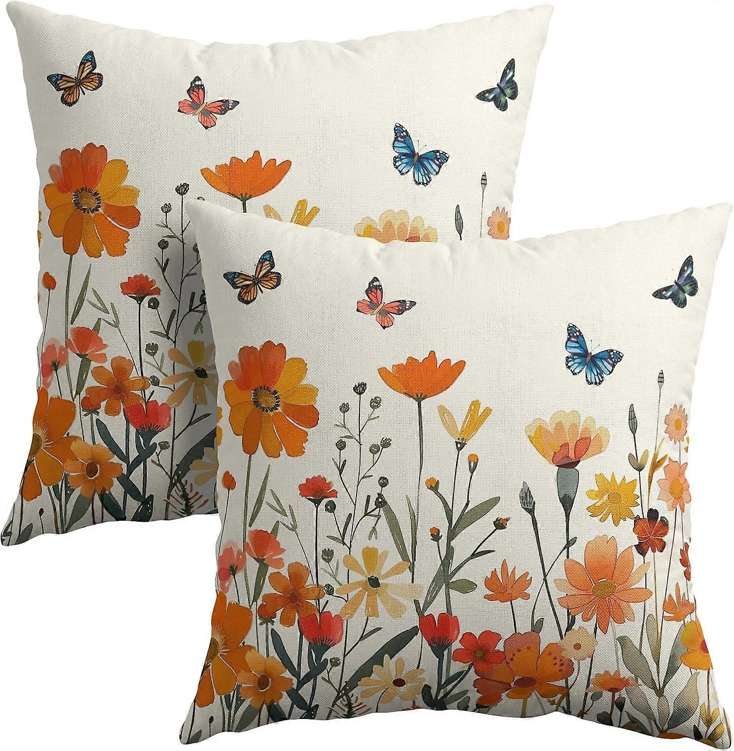 Fall Thanksgiving Floral Pillow Covers 18x18 Inches Orange Flower Butterflies Throw Pillow Case Set of 2 Autumn Decorative Pillow Cover Cotton Linen C