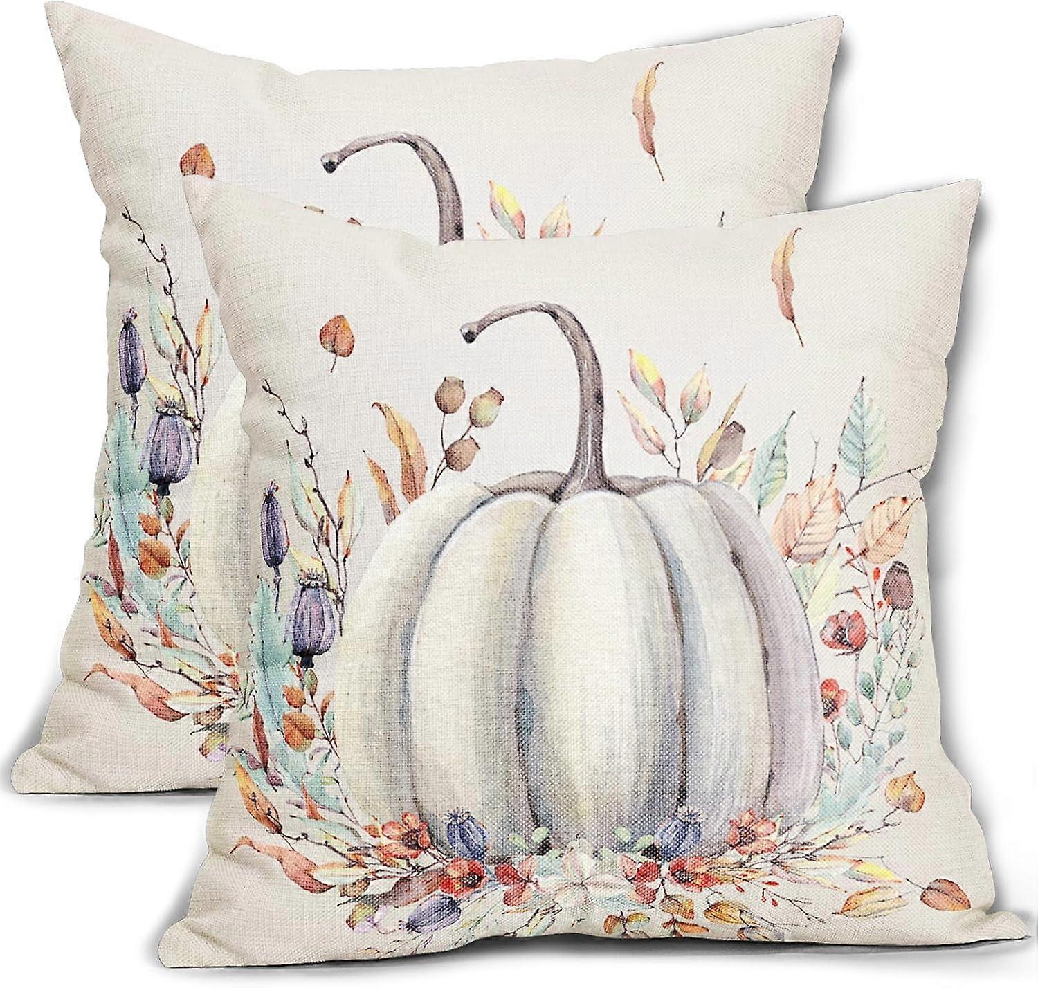 Fall White Pumpkin Pillow Covers 20X20 Inch Purple Flower Leaves Decorative Pillow Cases Seasonal Autumn Thanksgiving Harvest Throw Pillows Set of 2 H
