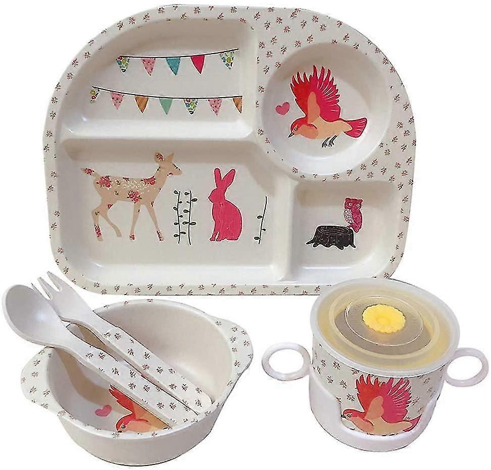Children's Tableware 5-piece Set With A Beautiful Pattern Made Of Bamboo / Bowl, Spoon, Fork, Cup, Menu Plate / For Small Children, Bpa And Phthalate-
