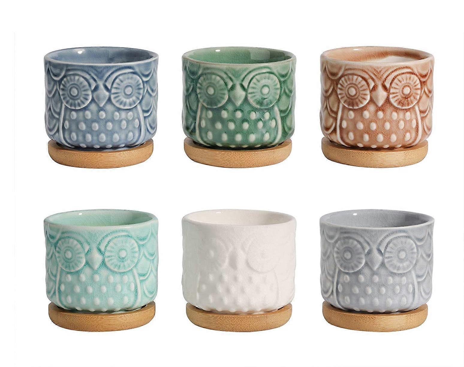 Set of 6 Ceramic Round Succulent Planters with Bamboo Coaster - Perfect for Indoor and Outdoor Planting, Ideal for Home and Office Decor, Modern and S