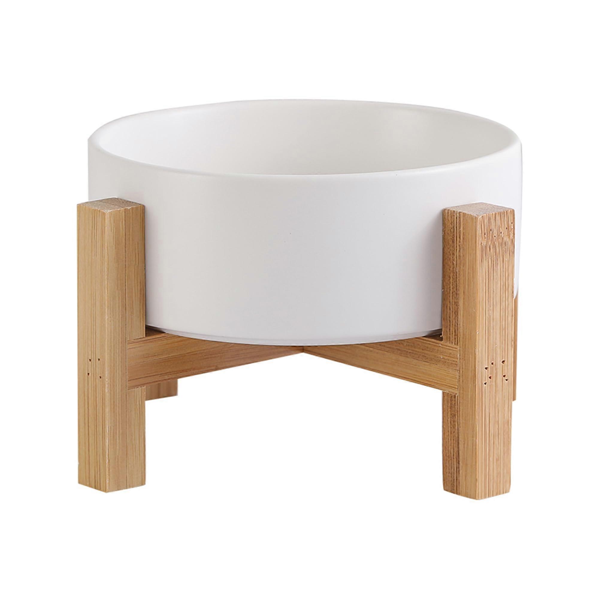 Elevated Ceramic Cat Bowl with Bamboo Stand - Anti Vomiting Dog Dish for Puppies, 13.5 oz White Pet Feeder