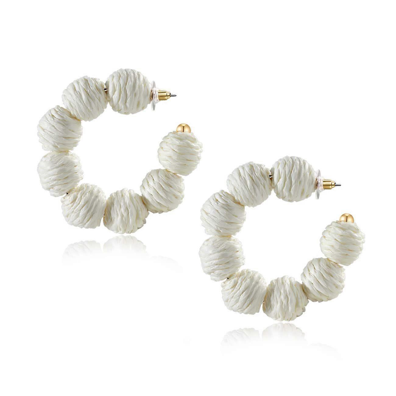 Rattan Earrings - Summer Boho - Raffia Ball Hoop Pendant - White