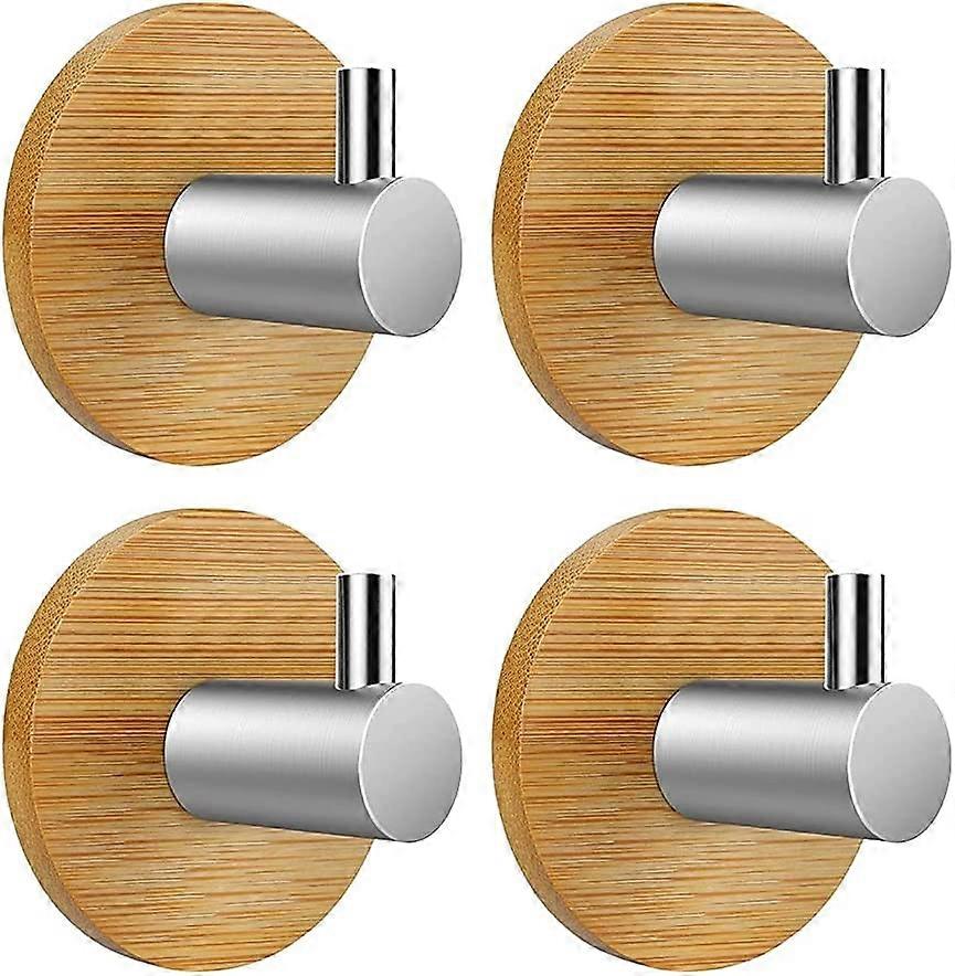 Adhesive Hook Wall Hook Self-Adhesive Hook Bathroom Kitchen Office Door, 4 Pieces (Bamboo And Stainless Steel,Round)