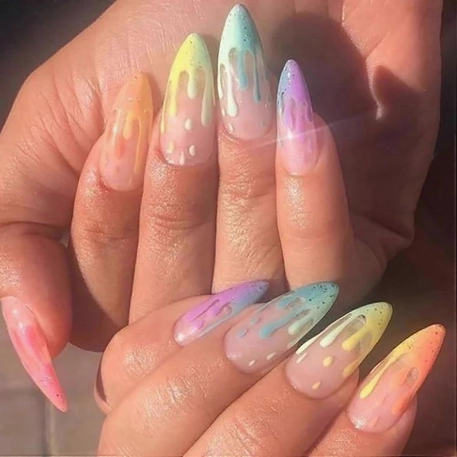 nice Smooth rubber nails, colored French pointed acrylic nails, almond face nails, rainbow firestick design 24 pieces