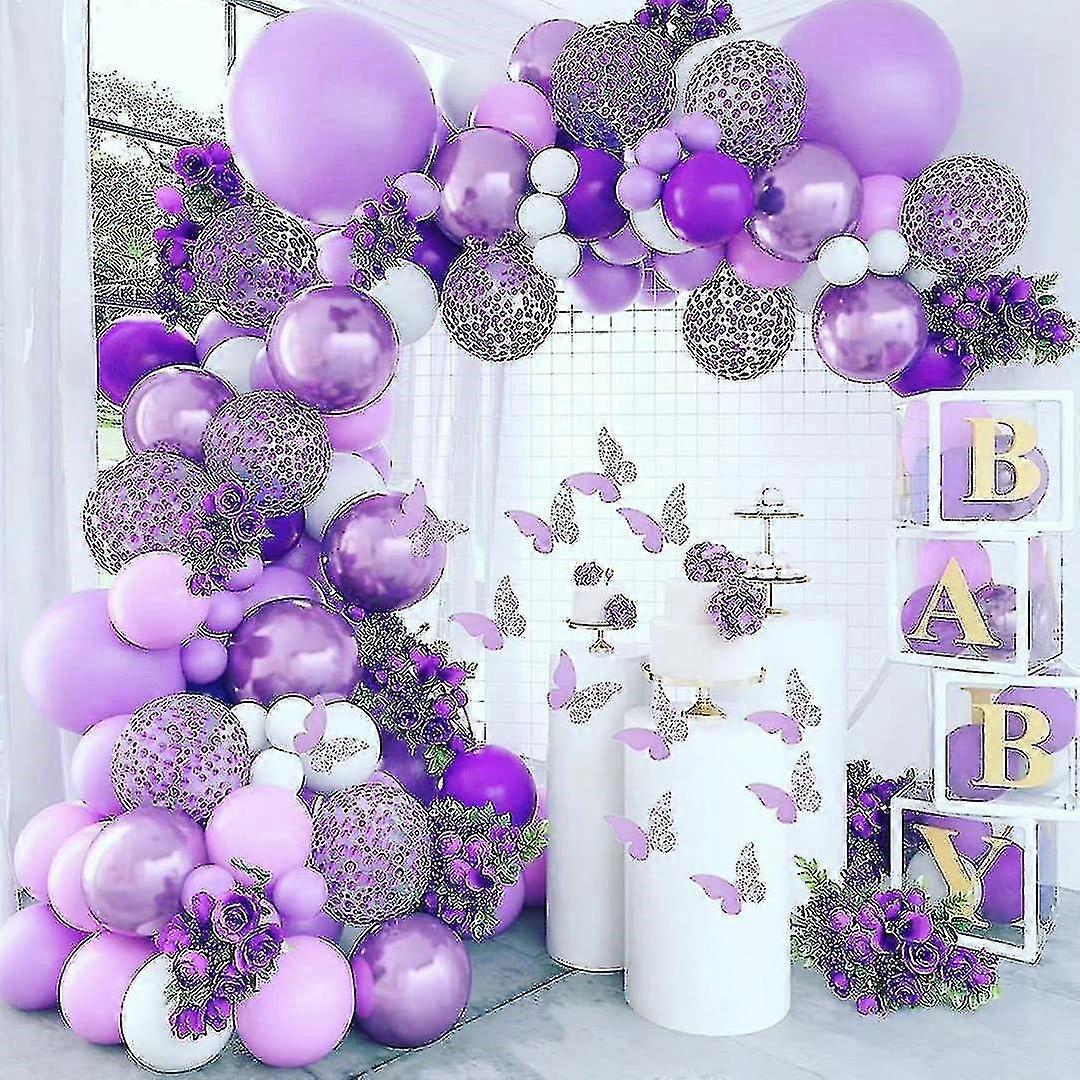 Purple Party Theme: Prepare an impressive birthday party for her with this purple birthday decorations pack. This style of birthday decoration creat a romantic, elegant, dreamy atmosphere, which would be a great party kit. Use them to create a dreamy background for your event. Compared to other party supplies, making it extremely popular and attractive among kids girls, and women.108 Pcs Purple Balloon Arch Kit Includes: 107 Pcs Latex Balloon and Tying Tool+1 Pack Butterfly Pin Dispenser(10 Pcs ),1 roll of balloon tape strip is 5 m/ 16 feet in length, which can make different types of balloon arches and garland, bring you a variety of beautiful graphic styles. Our balloons are at least 10% thicker than the majority of balloons found online and in the shops, which means that they hold a stronger color and are really difficult to burst.Safe Material: All balloons from this set are non-toxic, strong, and long-lasting. Environmental Protection And Recyclable. All materials are of high quality and have good safety. The balloons support air and helium, last for a long time, safe for children. A great party bag filler.Balloon Chain: 1 x 18in Macaron Purple balloon;1 x 18in matte purple balloon;5 x 12in purple sequined balloon;5 x 10in matte dark purple balloon;15 x 10in matte light Purple balloon;15 x 10in macaron purple balloon;10 x 10in pearly purple;10 x 10in matte white balloon;10 x 10in metal purple;10 x 10in metal gold balloon;10 x 5in Macaron Purple Balloon;10 x 5in Matte White Balloon;1 Pack of Butterfly Cake Topper;1 x 5m Balloon Chain;1 x Dispensing;2 x Ribbon;1 x KnotterEasy to Assemble: The balloon tie tool helps tie balloons easily, faster, and painless on fingers. Hang them from the ceiling, above a table, under the veranda, or from branches in trees. The Balloons garland strip can be reusable if you're careful with them. Great for a graduation party, wedding, birthday, baby shower, Christmas, anniversary, and any special celebration activity.100% High Quality: reusable party matte balloons are made from 100% natural non-toxic rubber, please be kindly assured to use our balloons which are biodegradable and decompose as fast as an oak leaf in your backyard. A certain color difference occurs after inflation, but the color effect will be better. Please DO NOT overfill the balloons and also avoid sunburn, overheating, pointed objects, and excessive friction.
