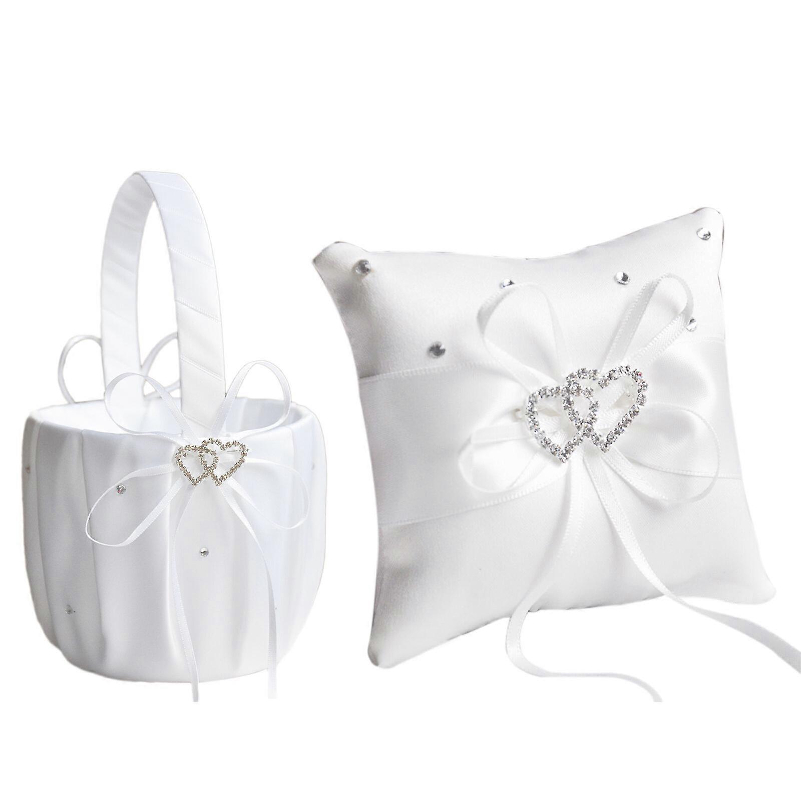 Wedding Flower Basket and Ring Pillow Set with Rhinestone Decor, Handmade Ribbon Bowknot in White, Purple, Red, Blue - 2 Piece Wedding Supplies (22x13