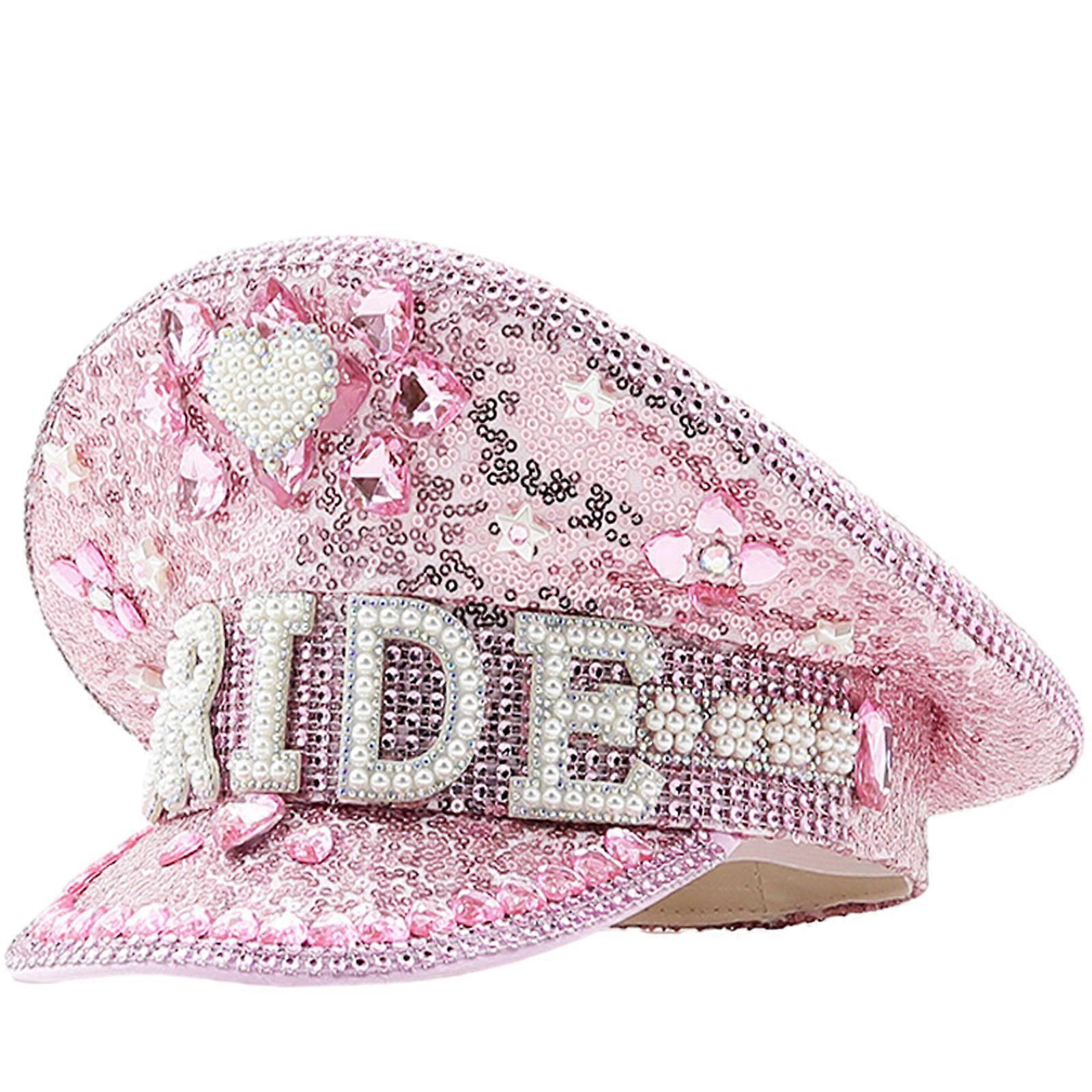 Rhinestone Sequins Hat for Wedding Bride Glittering Pink Sergeant Hat Novelty Birthday Party Captain Hat for Night Club Pink
